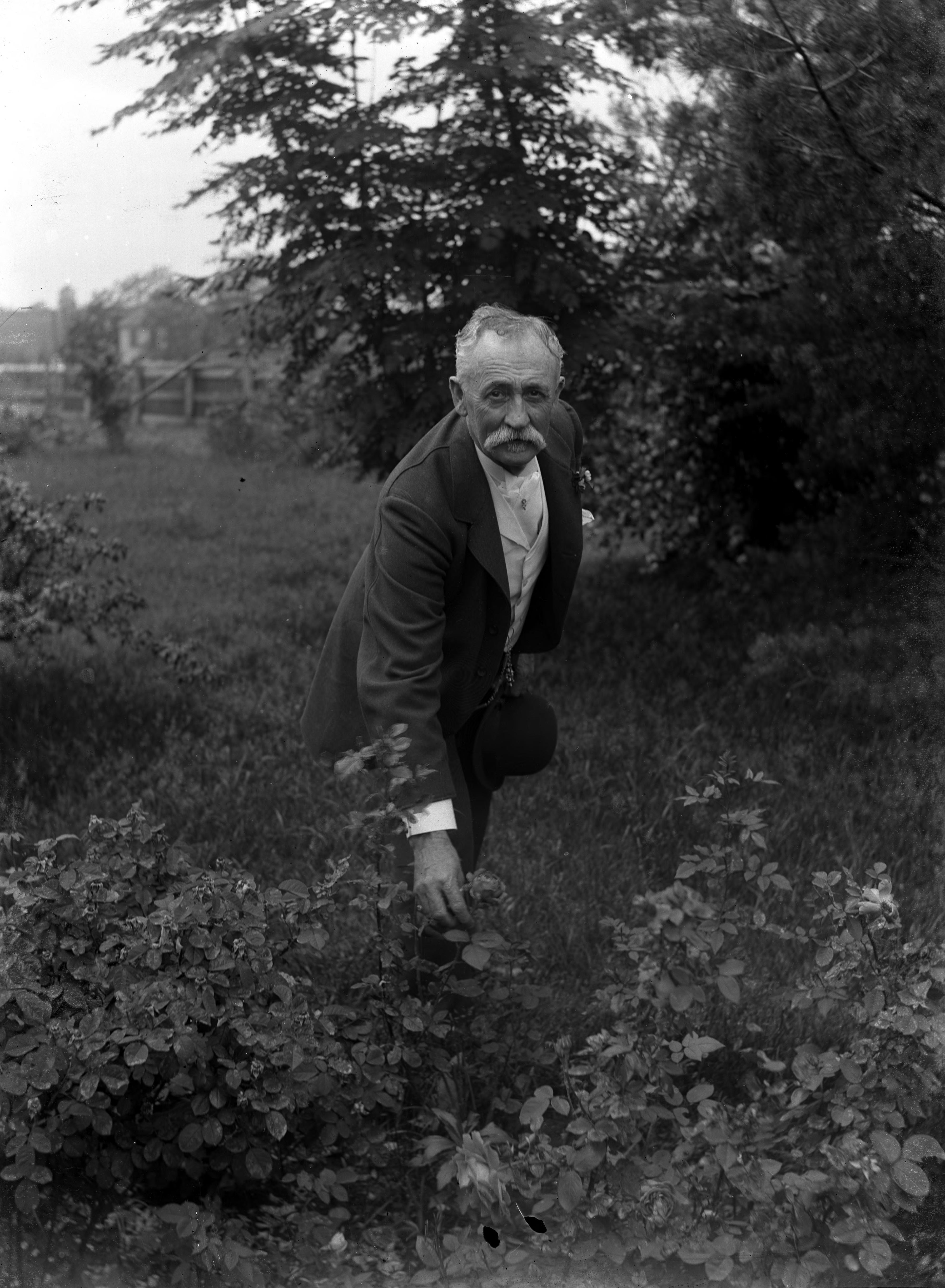 Identified as Will S. Hay in yard with roses.