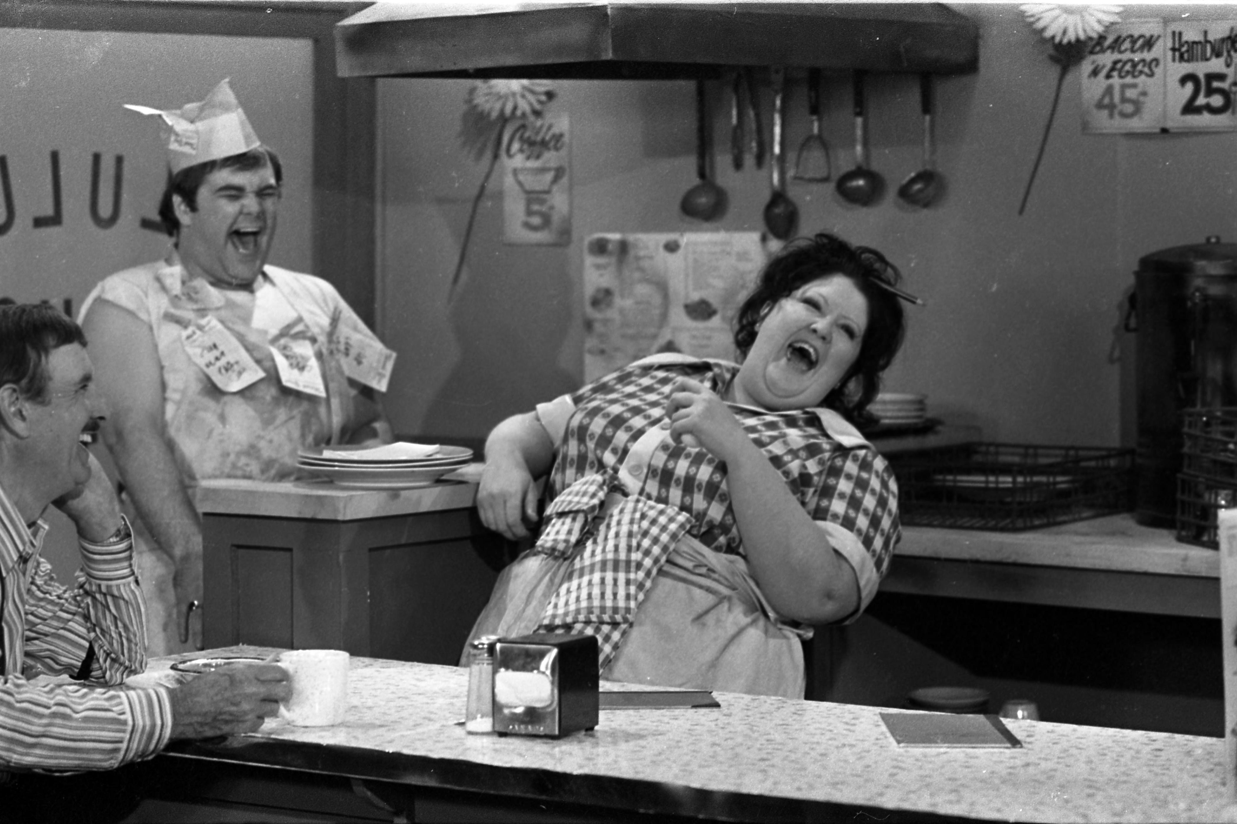 Evansville Courier photographer Sonny Brown was a friend of Hee Haw cast member Grandpa Jones, who was born in Niagara, KY (in Henderson County---just across the river from Evansville, IN) and thus was able to visit the set and take lots of backstage photographs. Here are Lulu Roman, Archie Campbell, and an unknown actor.