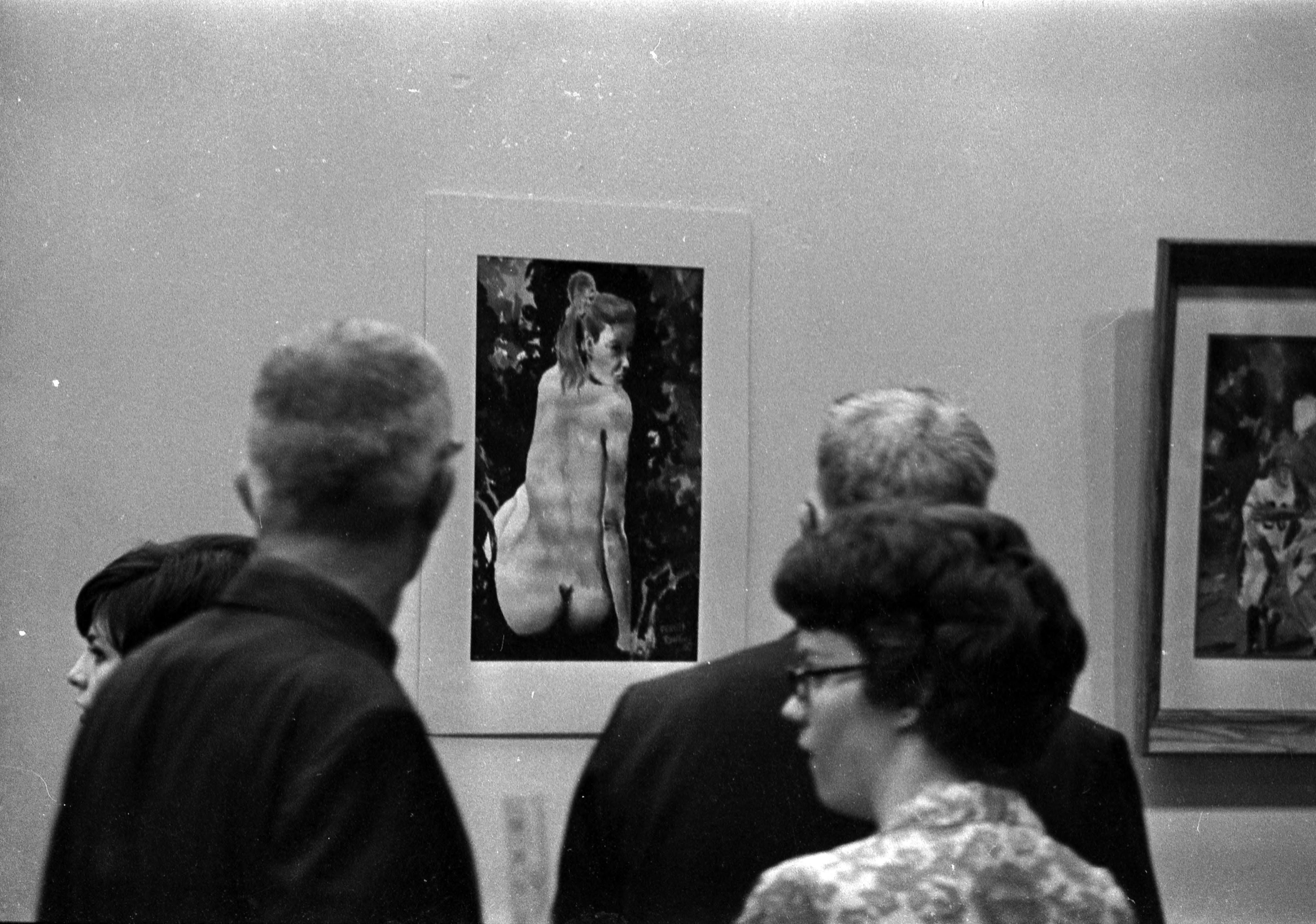 Group of people, standing in front of a painting of a nude woman. The painting is signed by Dennis Rowe, with the date of '68. Partially visible is another painting of what appears to be Athletics figures. The location is unidentified, possibly a gallery or museum.