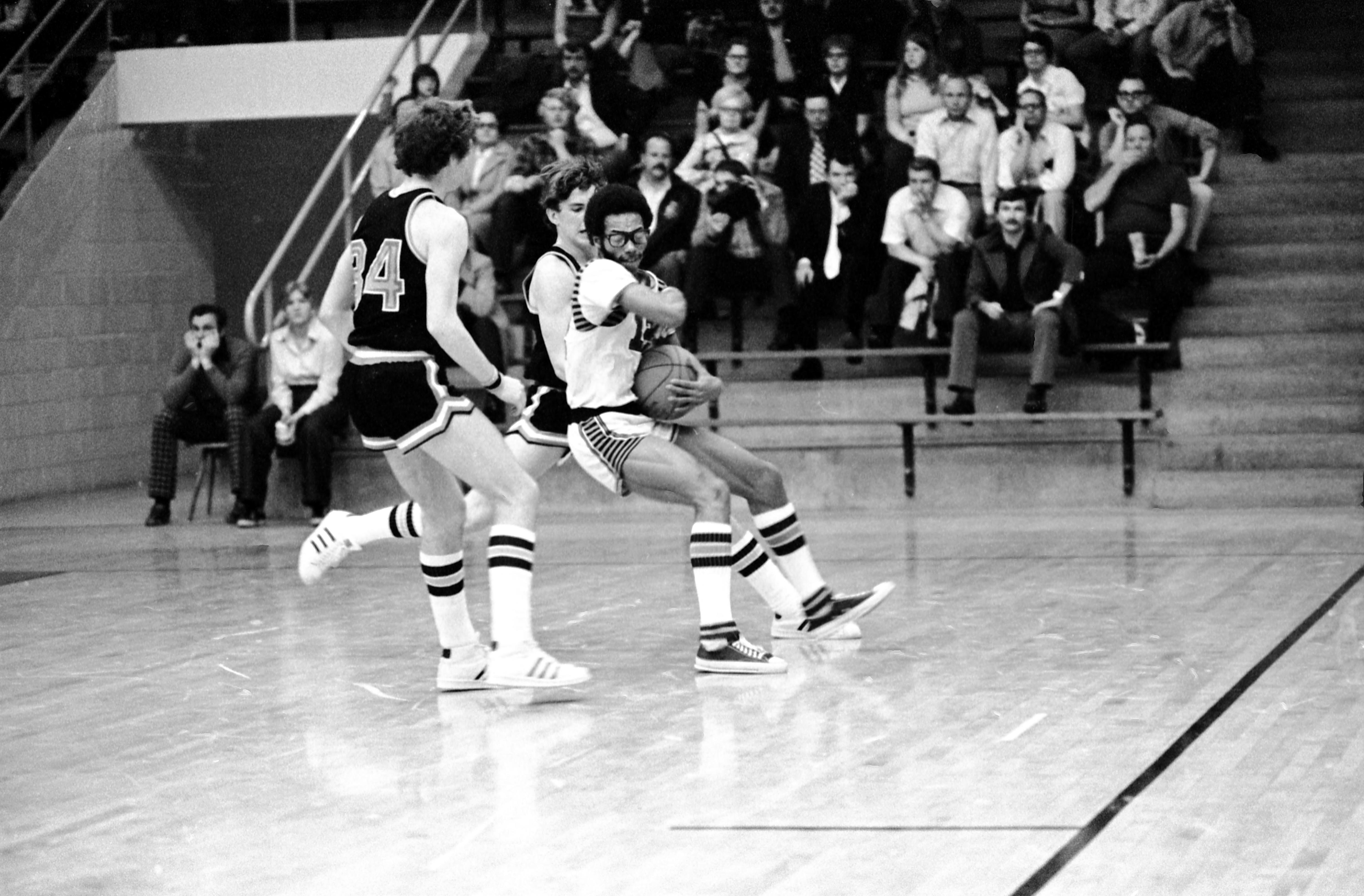 Basketball game, with one team's uniform saying Washington. The other team's identity is unknown, and it is unclear if this is high school or college. The seating does not look like bleachers, so this is possibly Roberts Municipal Stadium at 2600 Division St. This facility was razed in 2013.