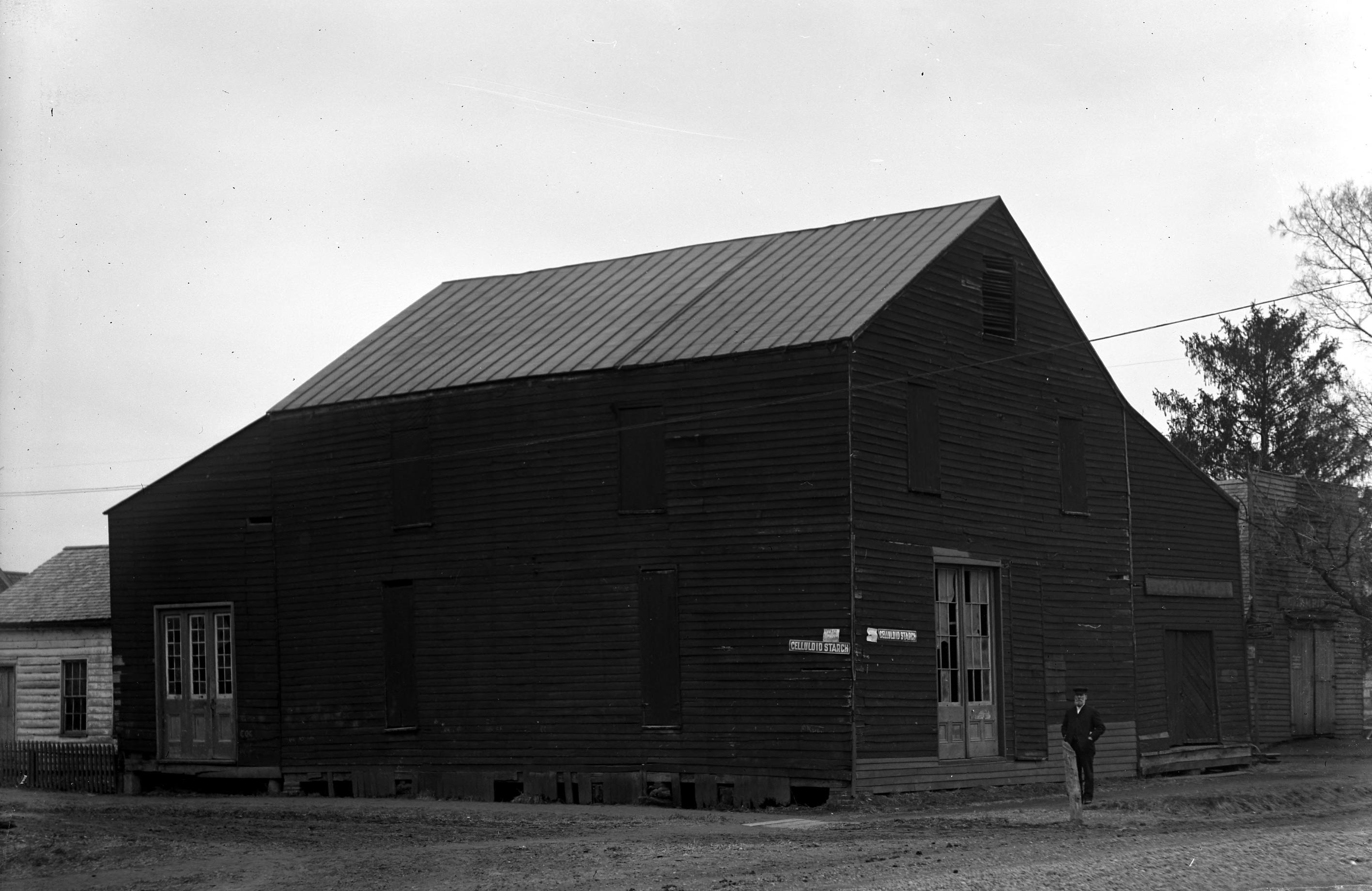 A Harmonist granary and warehouse at the southeast corner of Main St. and South St., with a man standing in front. This is not the same as the Rapp-Owen Granary, The Granary, in MSS 247-4071.
