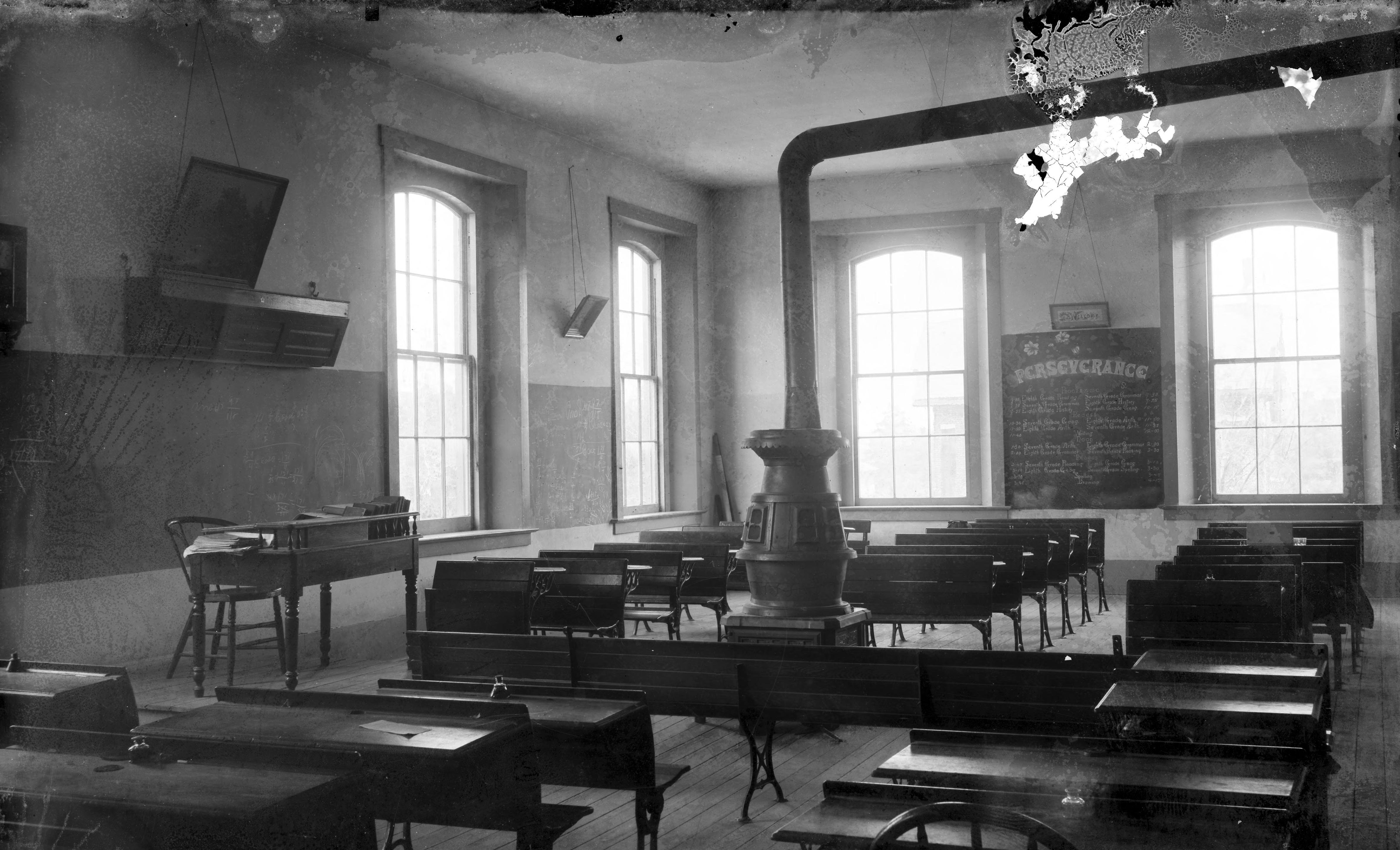 ""This photograph shows the interior of a seventh and eighth grade classroom in the old New Harmony School. Mathematics problems can be seen on the chalkboards at left and a ""Programme: of the day's lessons is written on the rear chalkboard." (Images of America: New Harmony Indiana. Arcadia Publishing, 2000, p. 118).