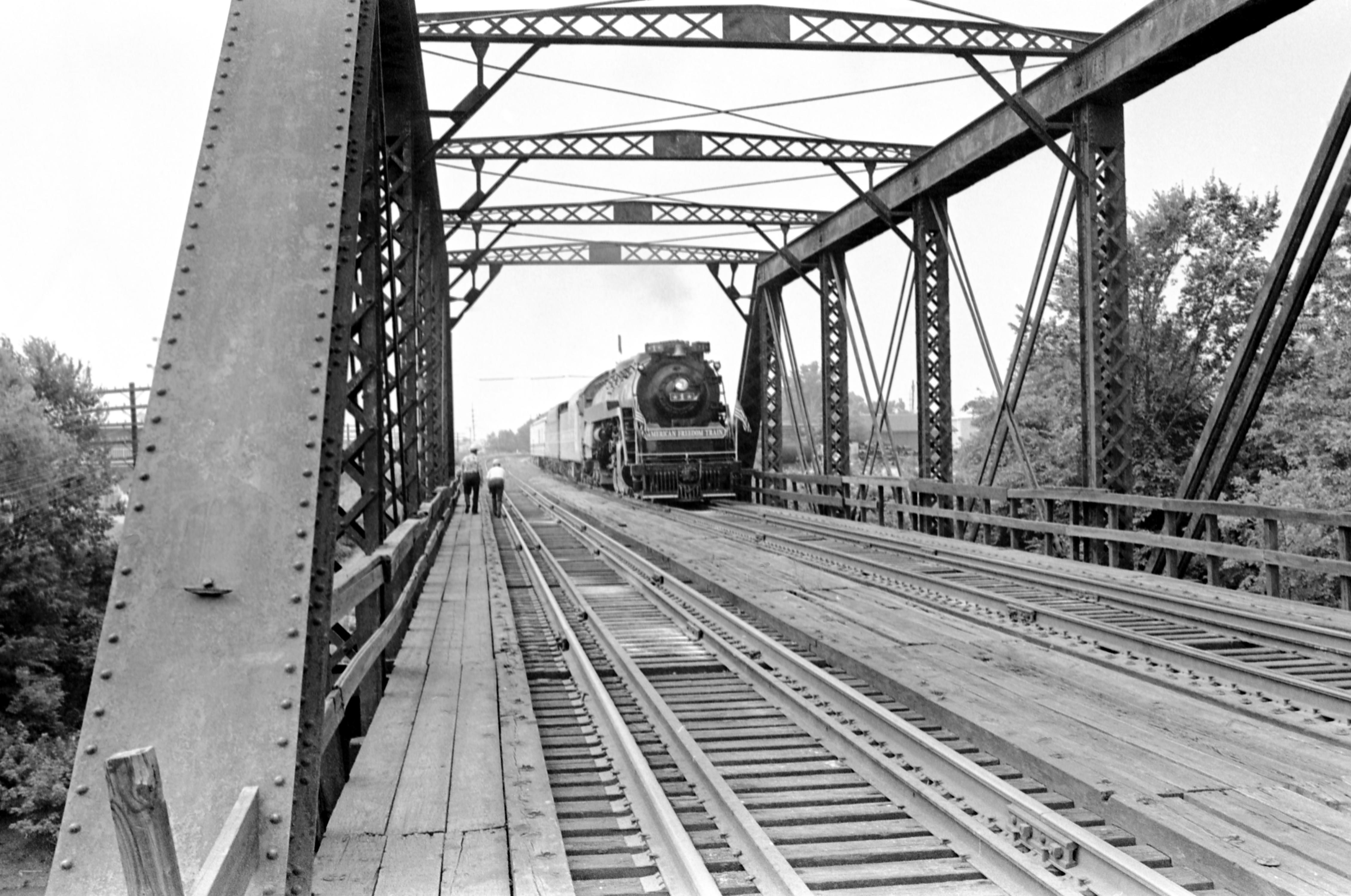 American Freedom Train crossing a bridge, with 2 men standing to the wide, watching its approach.""The triumph of the steam-powered American Freedom Train was, indeed, the only nationwide celebration of the Bicentennial. It was pulled by steam locomotives in the age of the diesel, and would improve on the three display cars of its predecessor, the 1947 Freedom Train. The American Freedom Train would feature twelve display cars, ten that visitors would go aboard and pass through and two to hold large objects that would be viewed from the ground through huge ""showcase"" windows. The display cars were filled with over 500 precious treasures of Americana. Included in these diverse artifacts were George Washington's copy of the Constitution, the original Louisiana Purchase, Judy Garland's dress from The Wizard of OZ, Joe Frazier's boxing trunks, Martin Luther King's pulpit and robes, and even a rock from the moon. The American Freedom Train (AFT) was a 26-car train led by one of three enormous steam engines restored just for the occasion. Over a 21 month period from April 1, 1975 to December 31, 1976 more than 7 million Americans visited the train during its tour of all 48 contiguous states. Tens of millions more stood trackside to see it go by." (http://www.freedomtrain.org/american-freedom-train-home.htm) The Freedom Train's only visit to Evansville was June 15-17, when it was parked behind the Civic Center/Vanderburgh Auditorium at 715 Locust St.