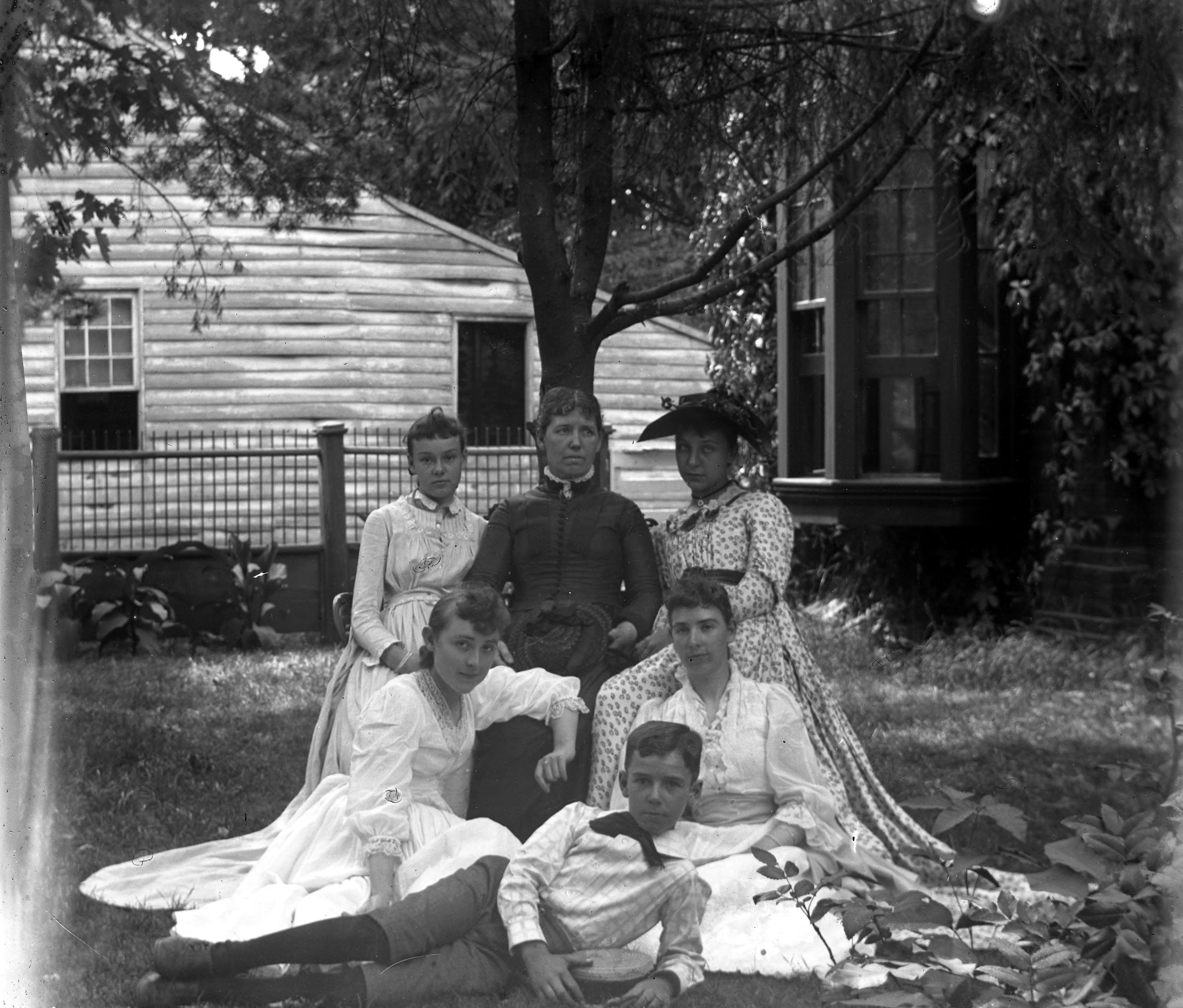 Five women and a young boy posing on the lawn at Owen's home at Church St. and Main St., now called a laboratory. The only ones identified are Louise Hill back right, with hat) and Eloise Mumford (back left)"