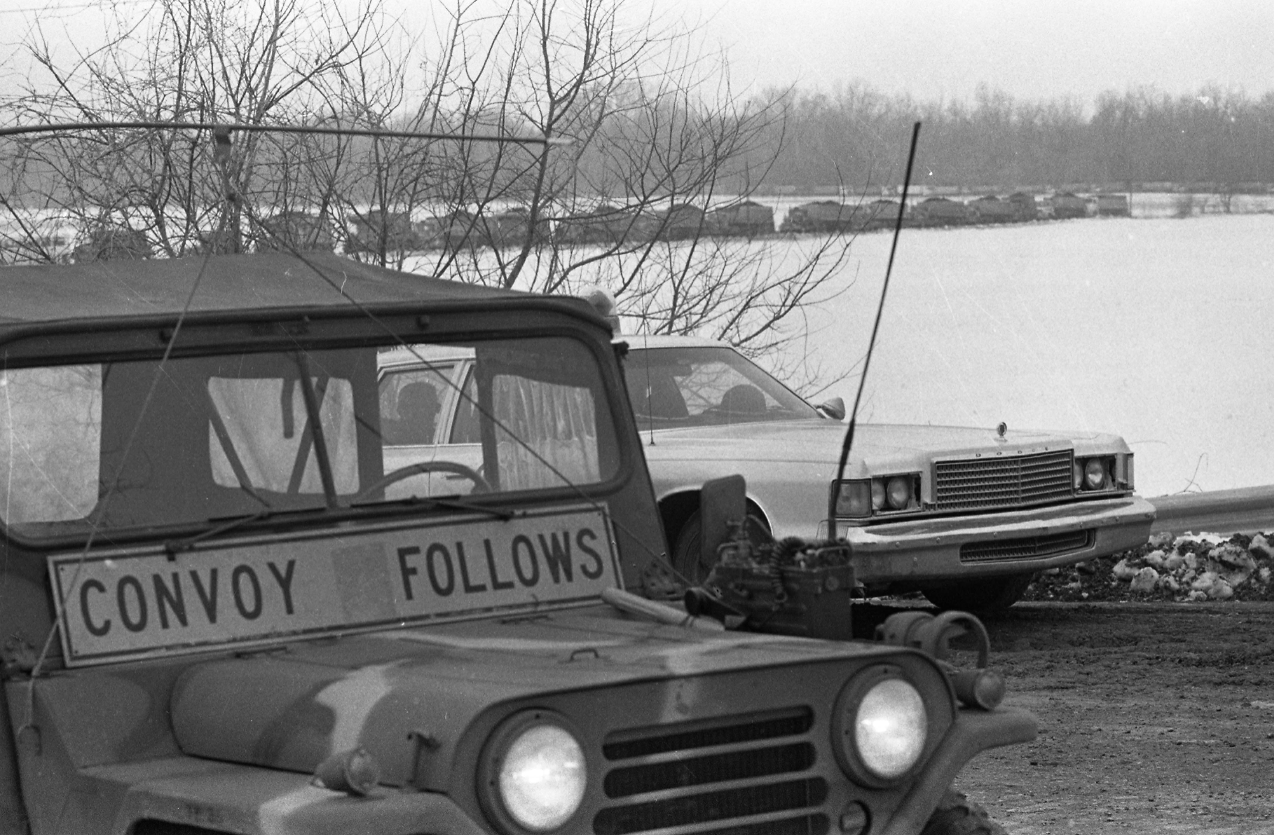 In December 1977 the UMWA (United Mine Workers of America) began a 110 day strike nationally. Violence ensued in many parts of the country, and on February 14, 1978 Indiana governor Otis Bowen ordered the Indiana National Guard to assist the state police in escorting coal convoys in delivering coal to Indiana utilities. Here a couple of lead cars are prepared to lead the approaching convoy.