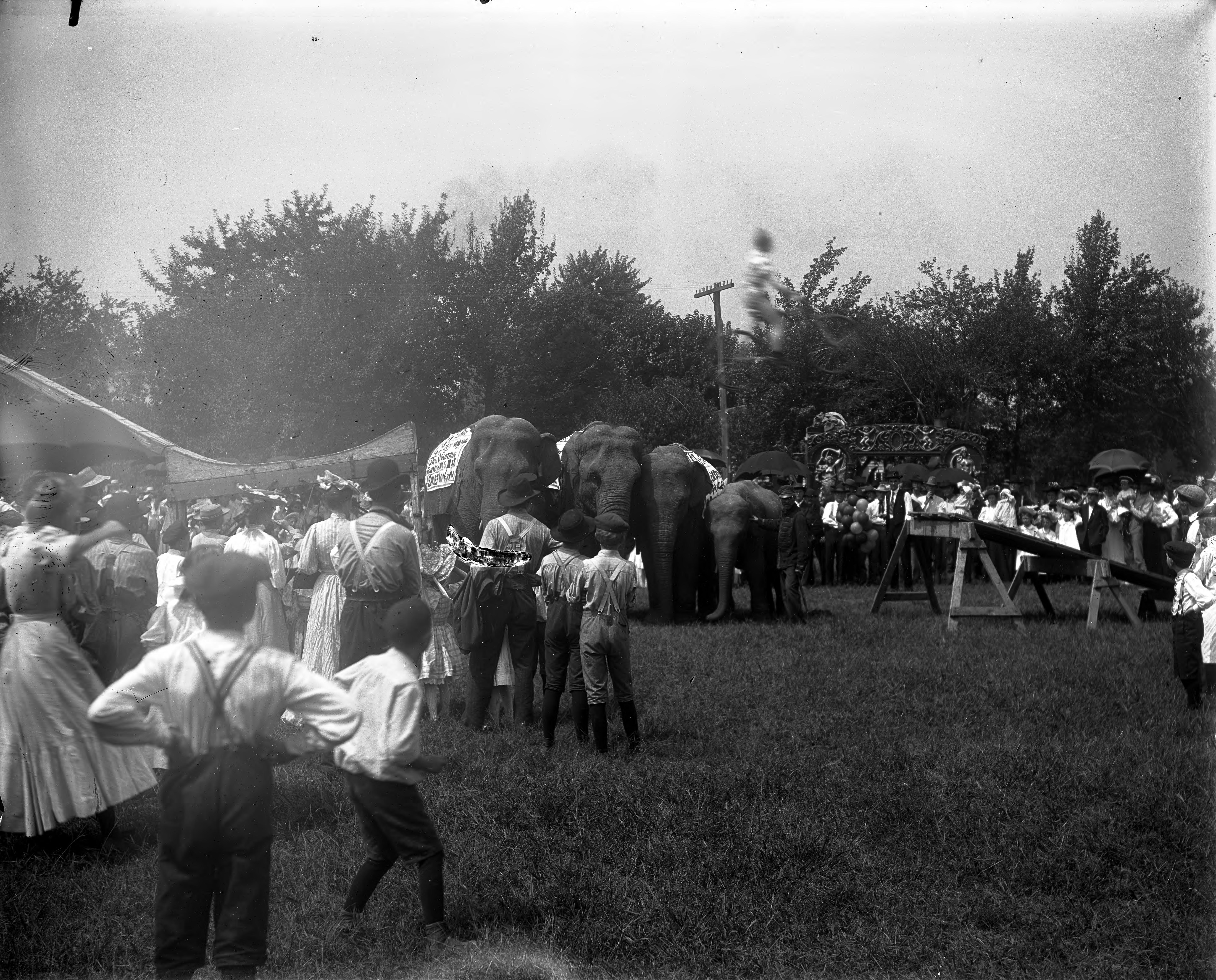 Cole Bros. Circus gathered in John Greve's field. Note that the cyclist is in mid-air.""The Cole Bros. Circus was a medium-sized American circus. It was founded in 1884 as ""W.W. Cole�s New Colossal Shows"" by William Washington Cole. In the 1930s, the circus employed two noted animal trainers, Clyde Beatty and Allen King, both of whom traveled in their own railroad cars.Another well-known performer with the circus was Bobo the Clown. As of 2014, Cole Bros. Circus was one of the few traditional circuses in the United States that remains under the Big Top tent. As of 2016 the show was essentially defunct, in large part due to being targeted by animal rights protests." (https://en.wikipedia.org/wiki/Cole_Bros._Circus)"