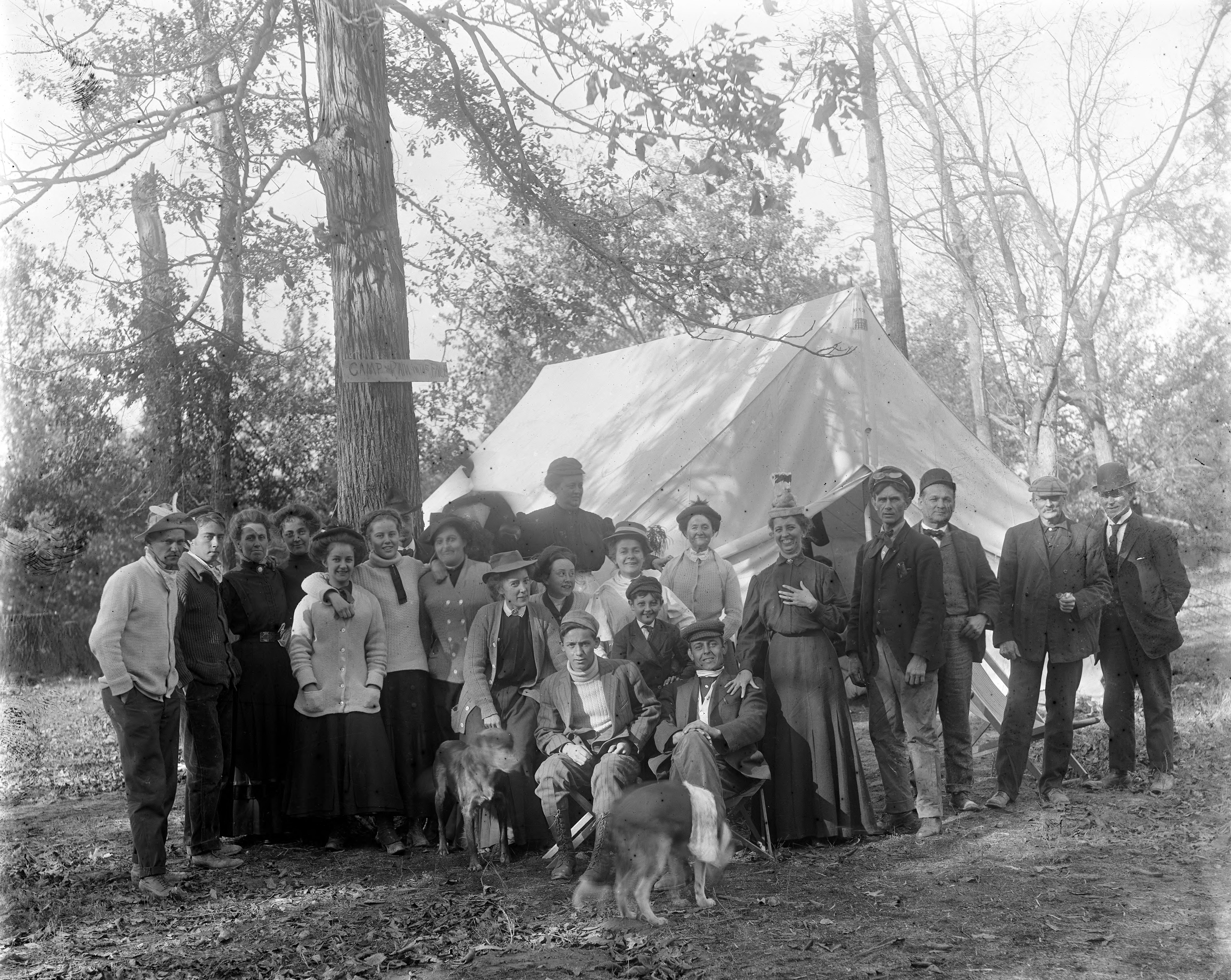Group of friends at ""Camp Rain in the Face," with Homer Fauntleroy (4th from right), his wife, Maud Miller Fauntleroy next to him, John Mott, and Elsie Wilhelm Overstreet.