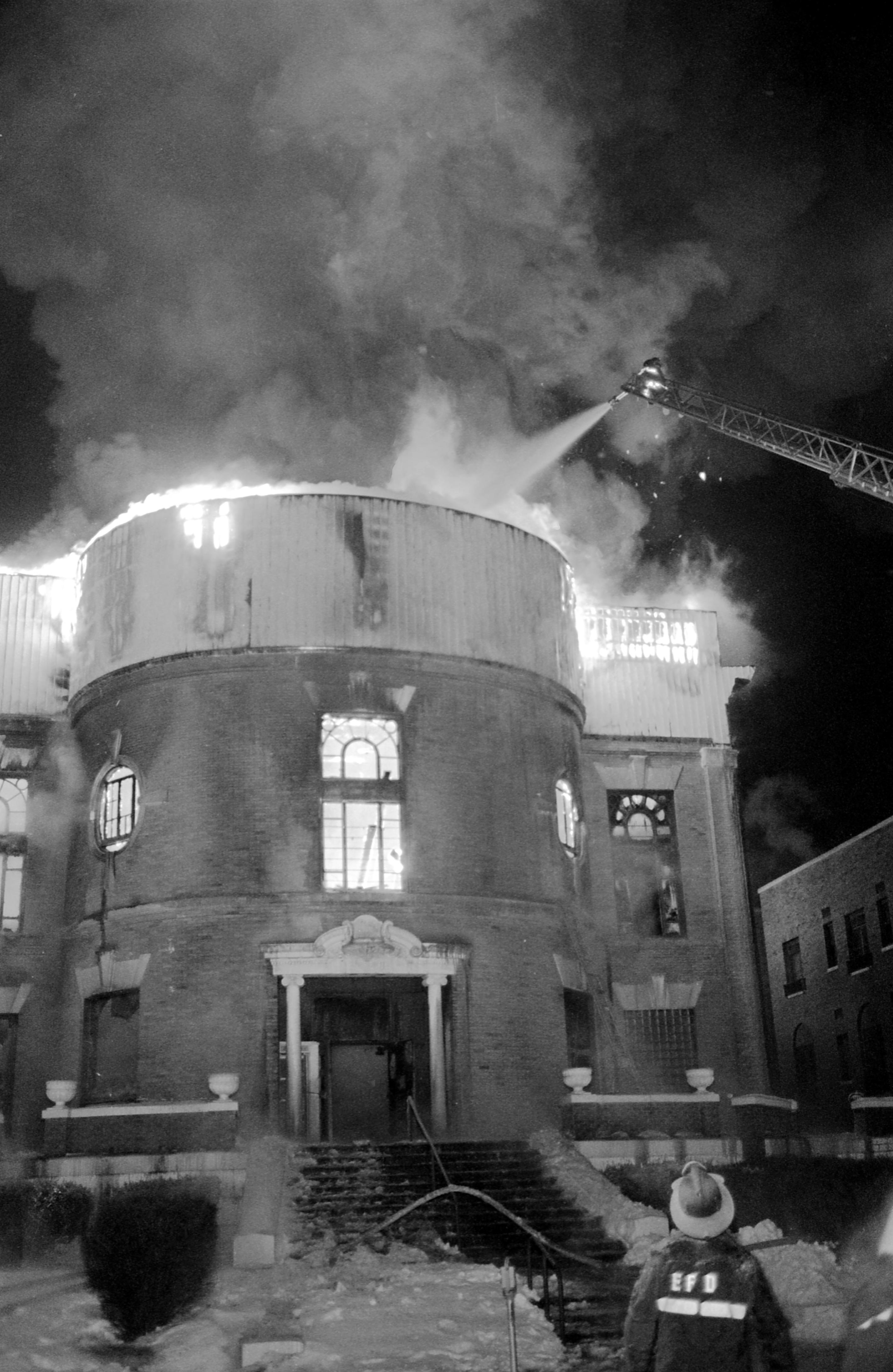 Pouring water down from a ladder truck at the front of the fire at Upstage Dinner Theatre at 100 SE 1st St. Built in 1904, this building housed the Elk's Club until the dinner theatre took it over in 1974. This fire completely destroyed the building.