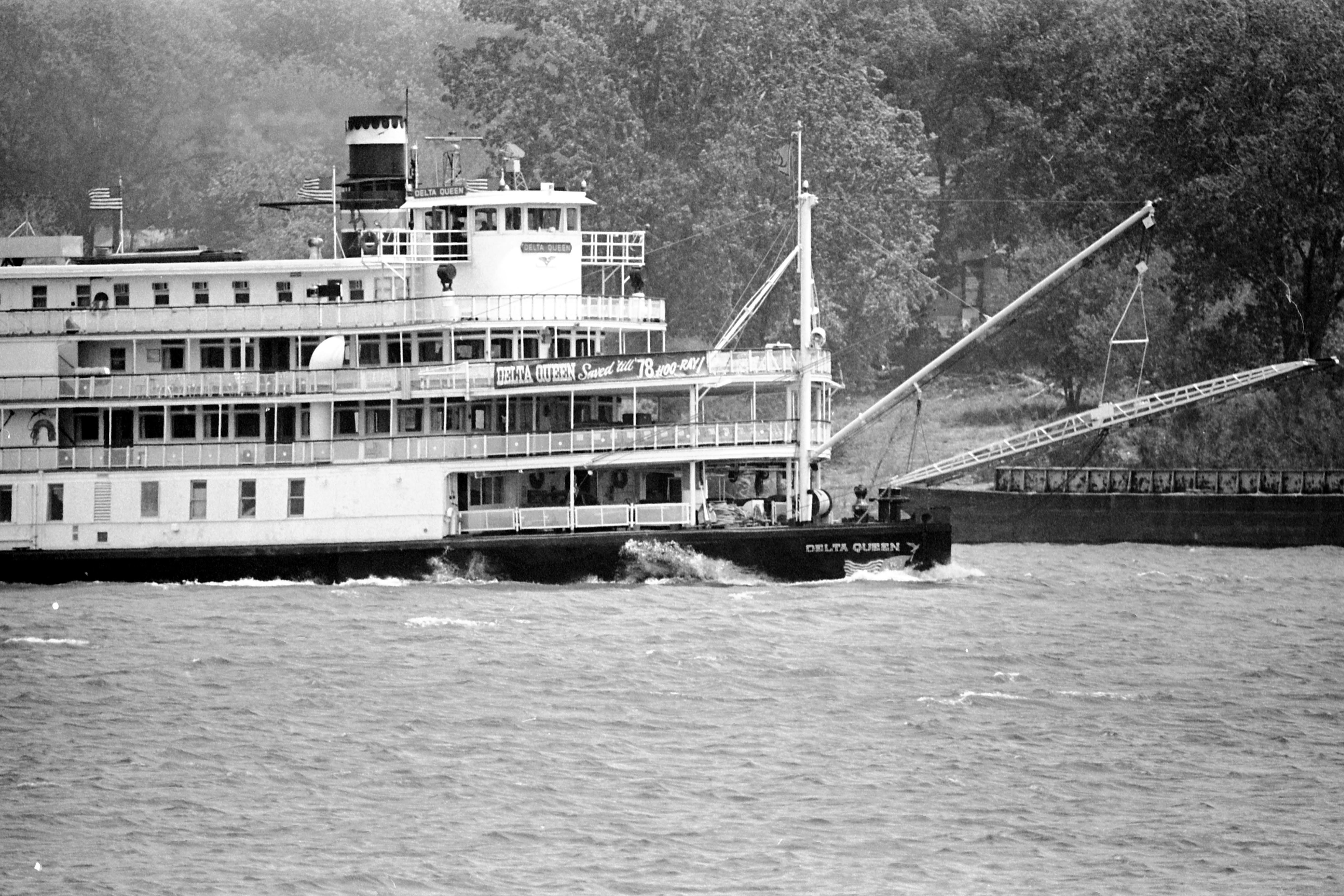 Close up of the prow of the Delta Queen on the Ohio River. A sign advertises that it is ""Saved 'till '78 HOO-RAY!" This refers to the fact that the boat got a congressional reprieve until 1978, being allowed an exemption from new fire regulations. There is a barge just beyond this.