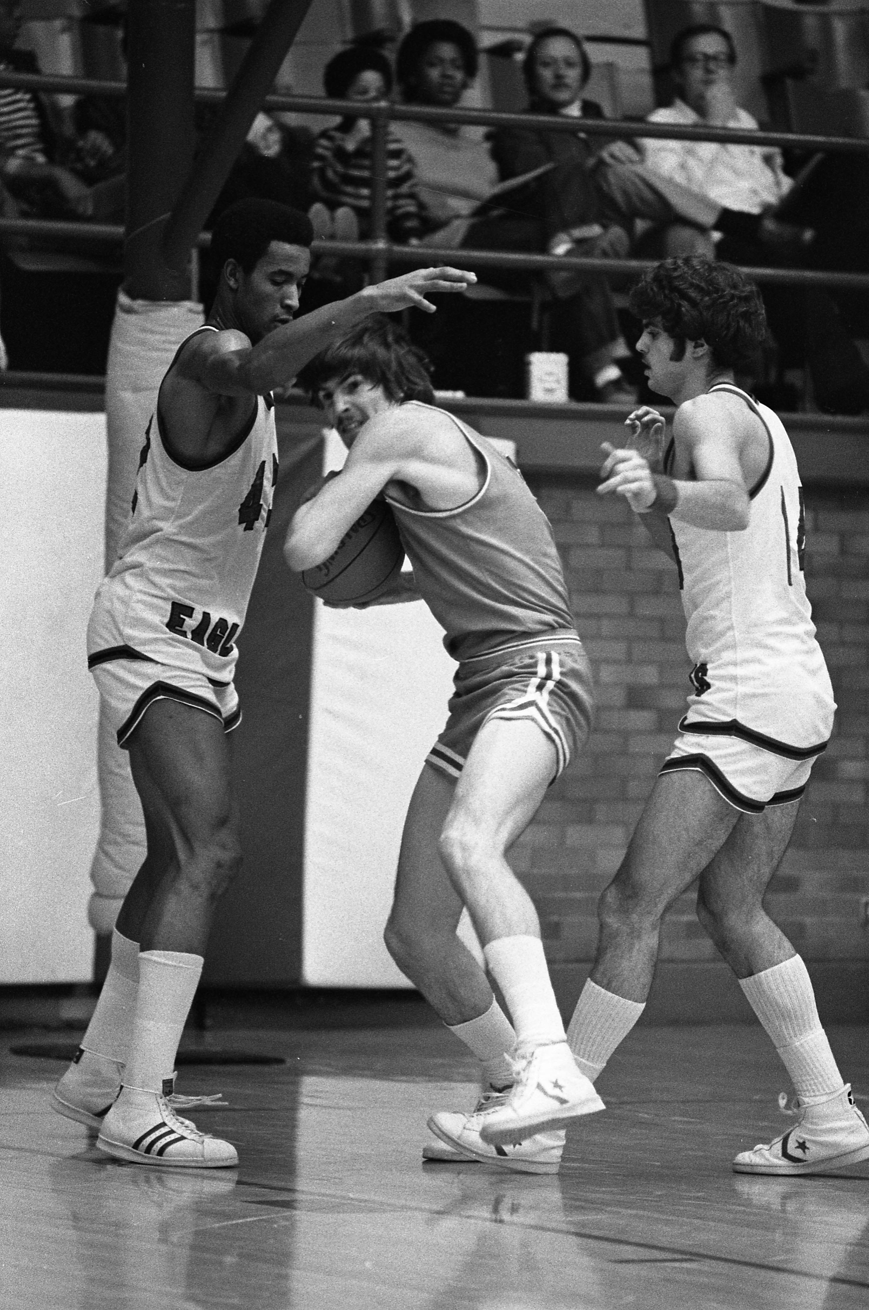 ISUE (Indiana State University Evansville, now USI/University of Southern Indiana) Eagles playing basketball against the Indiana Tech Warriors. ISUE won, 91-75. The 1979 ISUE yearbook identifies no. 42 as Cortez Collins. The other ISUE player is either no. 14 John Key or no. 14 [sic] Mark Block or no. 24 Ken Mask.