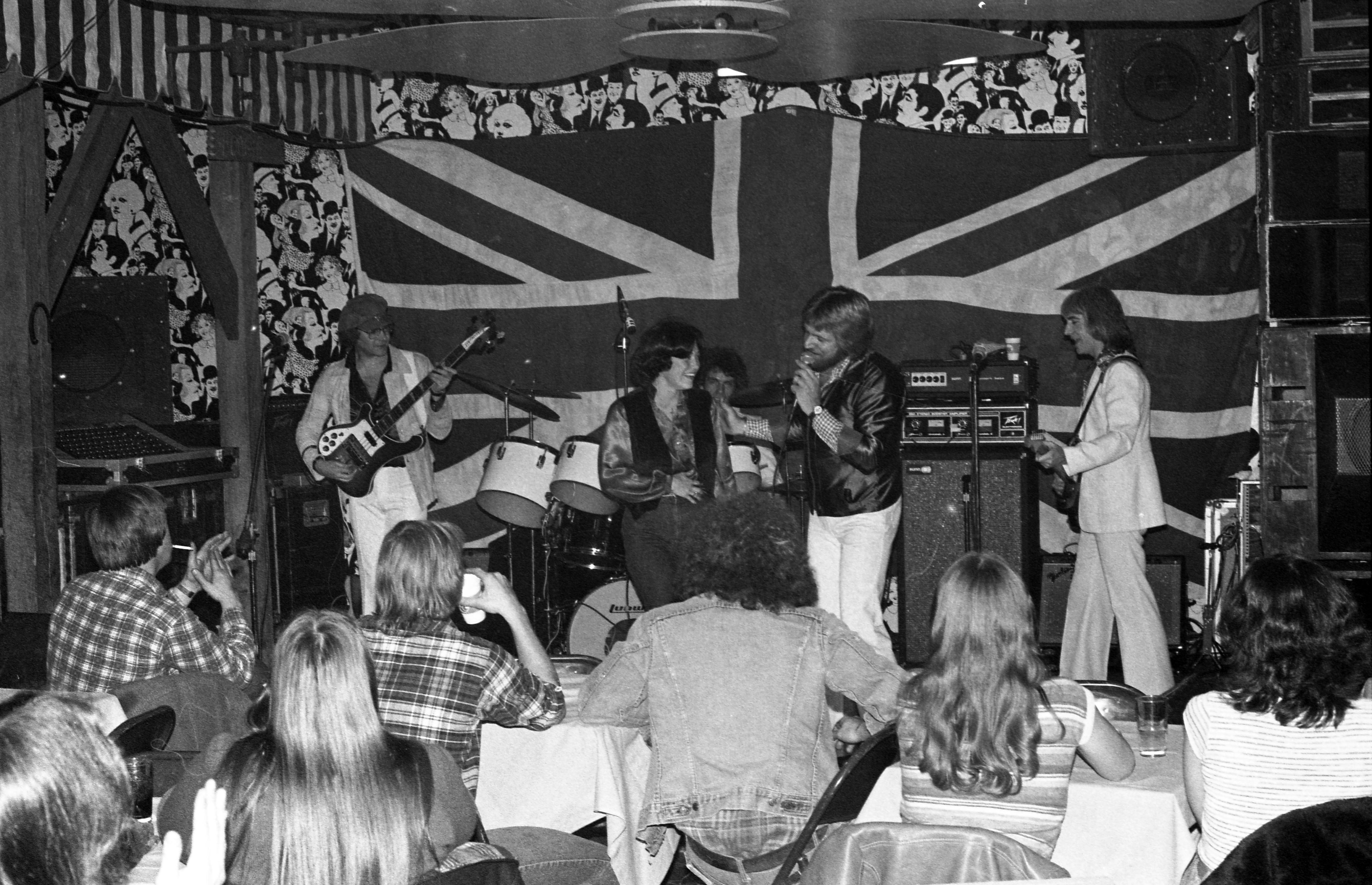 Unidentified band, with a British flag backdrop, playing in a nightclub-like setting