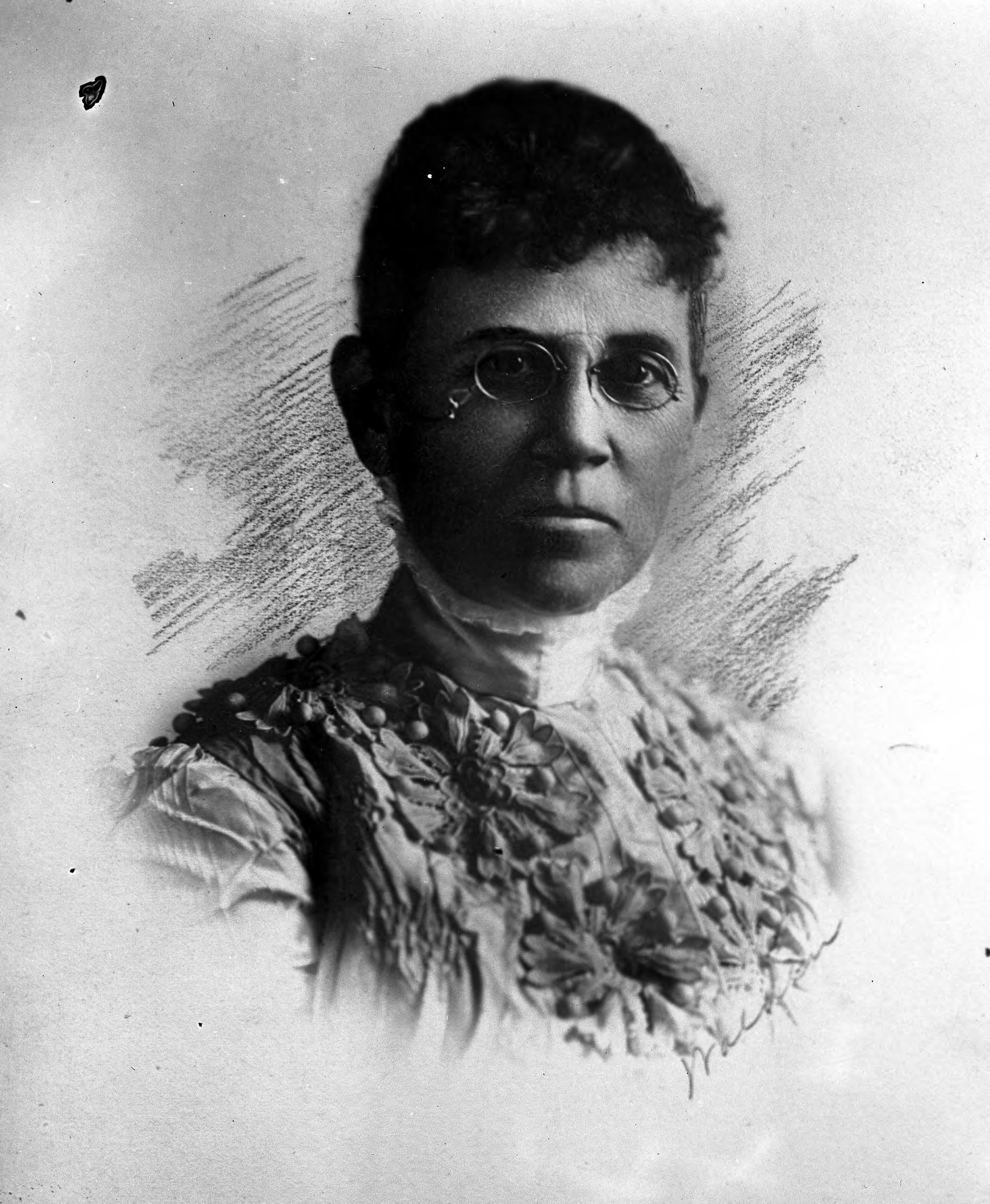 Nora Chadwick Fretageot (1858-1937). The Fretageot family's association with New Harmony began thus:""Marie Duclos was born in France and at some unknown date married Joseph Fretageot. She met William Maclure in Paris in 1819, not long after he had become President of the Academy of Natural Sciences of Philadelphia. Madame Fretageot moved to Philadelphia in 1821, where she established a school and, like Maclure, became interested in Robert Owen's principles for social reform. In 1826 both Maclure and Madame Fretageot moved to New Harmony to join in Robert Owen's experimental community. For reasons of health, Maclure resided there only a short time, but Madame Fretageot remained and managed his continuing financial support of science and education in New Harmony?against great odds. In February, 1833 she joined Maclure in Mexico City, and that August, she died there." (https://faculty.evansville.edu/ck6/bstud/fret.html) The woman pictured here married Marie's grandson, Achilles Henry Fretageot (1842-1906). She was the co-author of Historic New Harmony 1814-1914, an official guide to the centennial of the town.