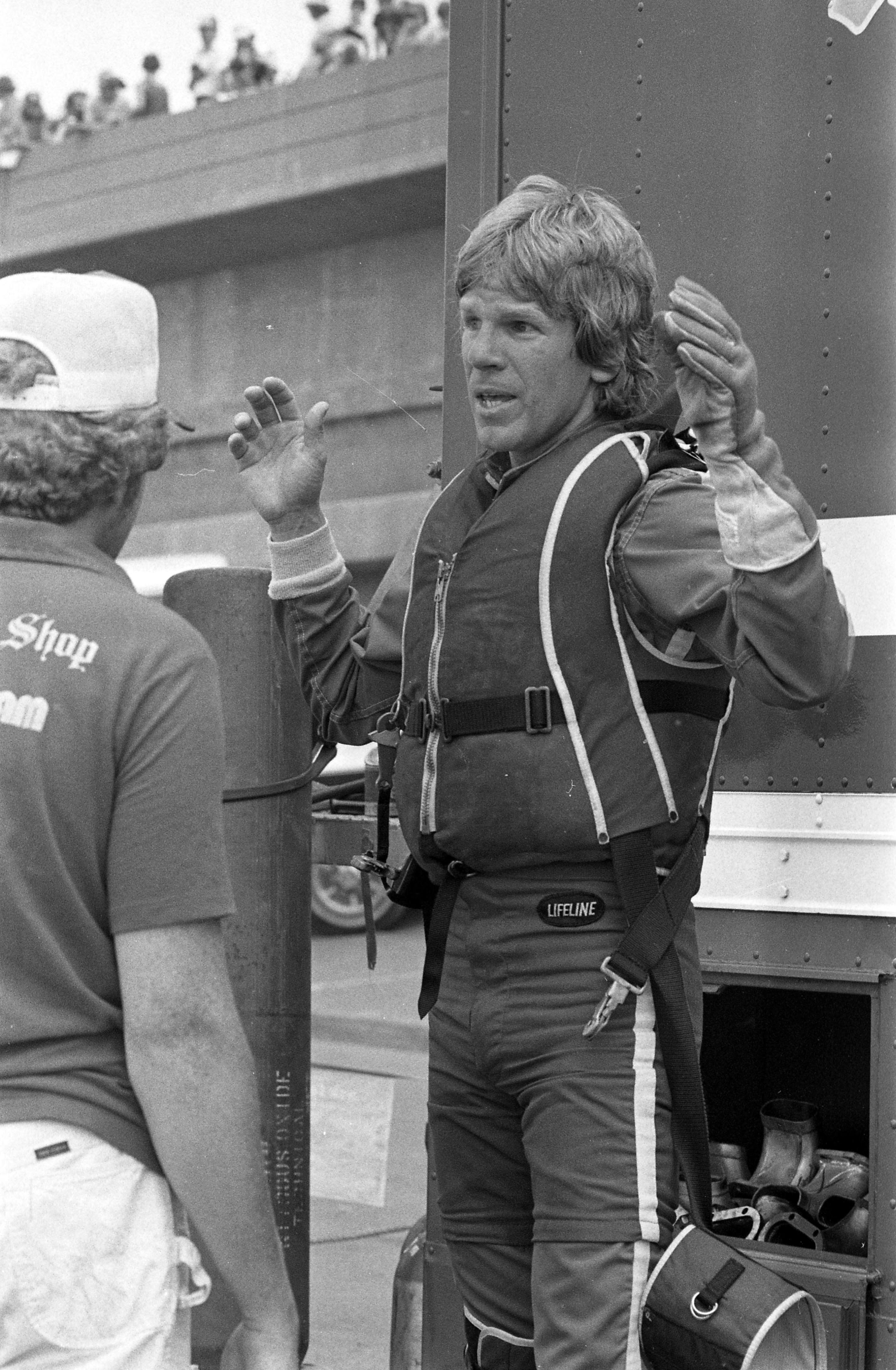 Thunder on the Ohio hydroplane races. Squire Shop boat driver Chip Hanauer talks to a member of his crew.