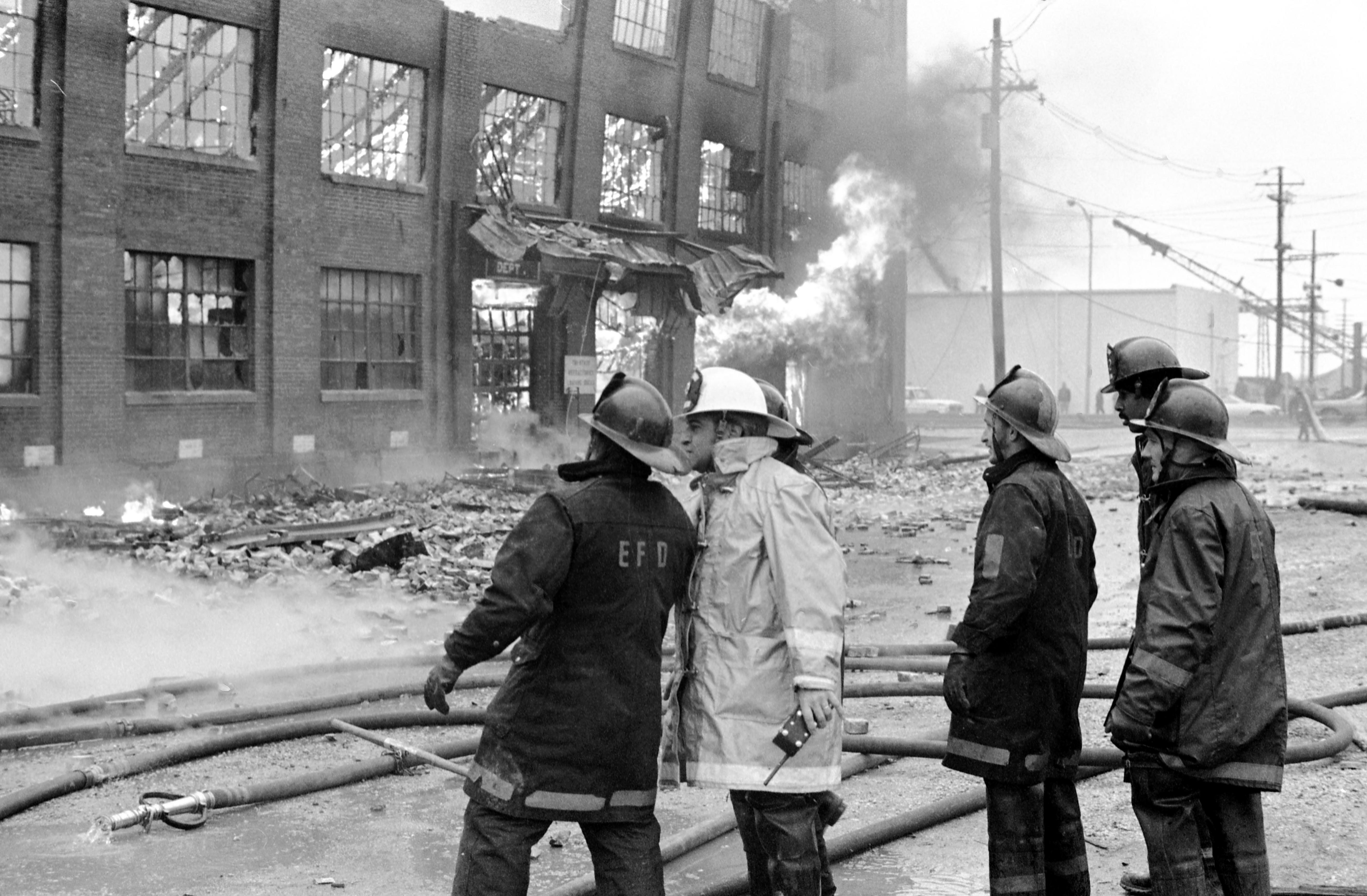 Five firemen discussing how to fight the fire at Universal Furniture Co., 1419 Pennsylvania St.