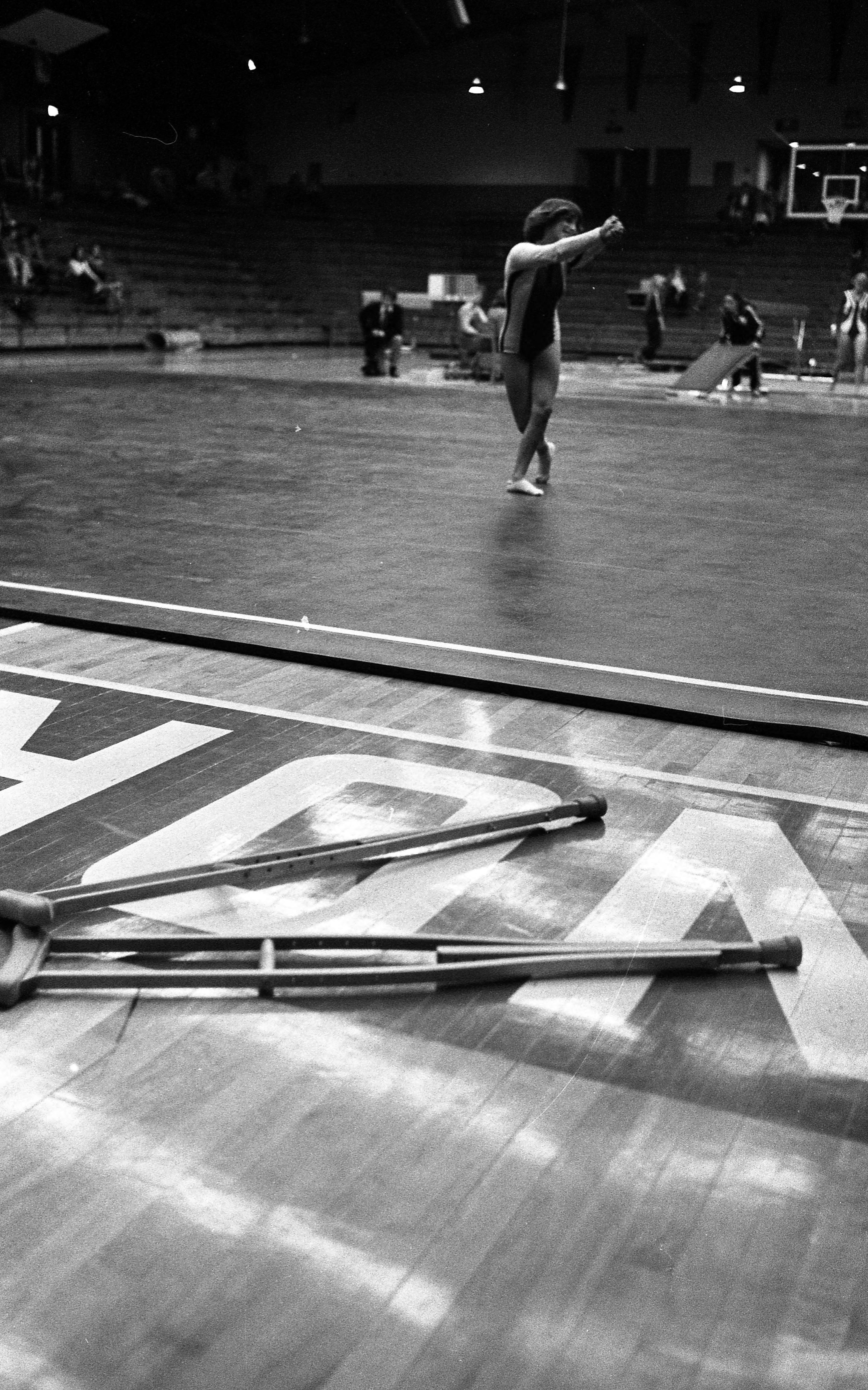 Arlyne Siegel, Harrison High School gymnast, performing despite her sprained ankle, at the Evansville sectionals at North High School at 2319 Stringtown Rd. The school still exists, but not at this location.
