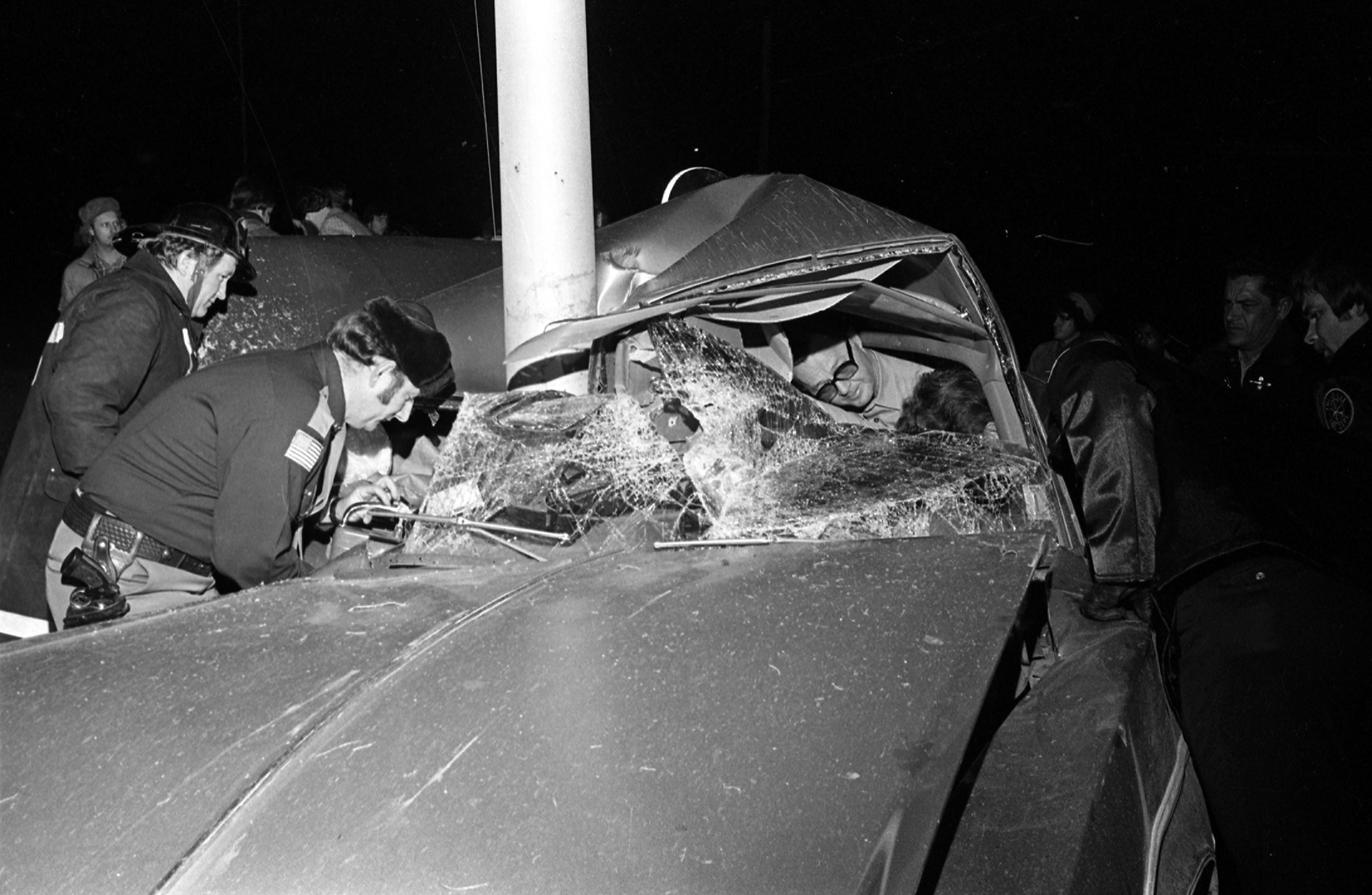 Looking from the front of a mangled car that has hit a utility pole, with fire and police personnel on scene. It appears as though there is a man in the back seat, but it's not clear if he's a victim or a responder.