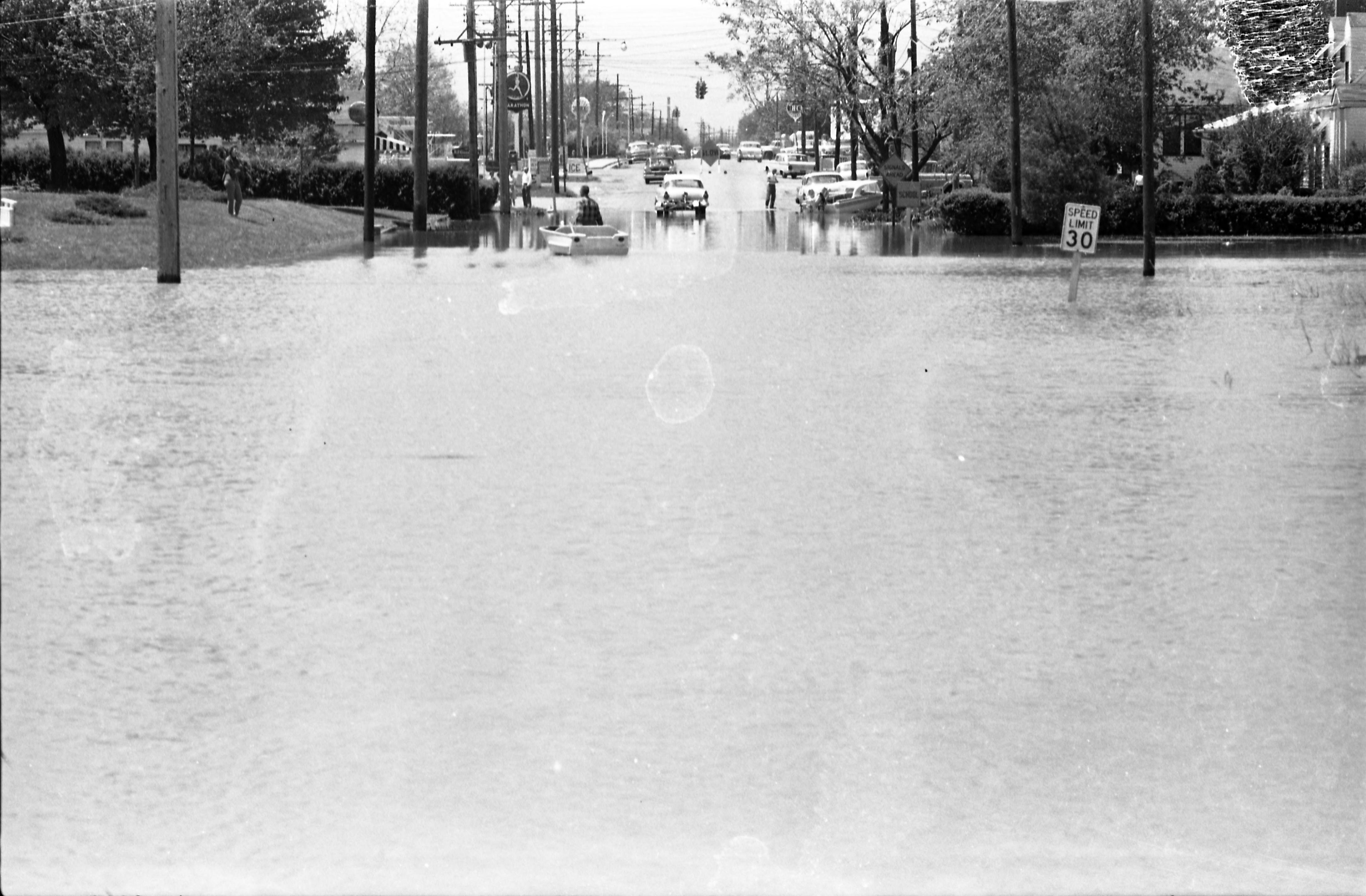 Flooded street, location unidentified. Heavy storms upstream, combined with 10 inches of rain locally over a weekend caused the Ohio River to finally crest at 2.5 ft. over flood stage, which caused water to also flood along the river's tributary, Pigeon Creek. Pigeon Creek winds through the city and a portion of it is near this location. The May 10, 1961 edition of the Evansville Press contains a good account of this flooding.