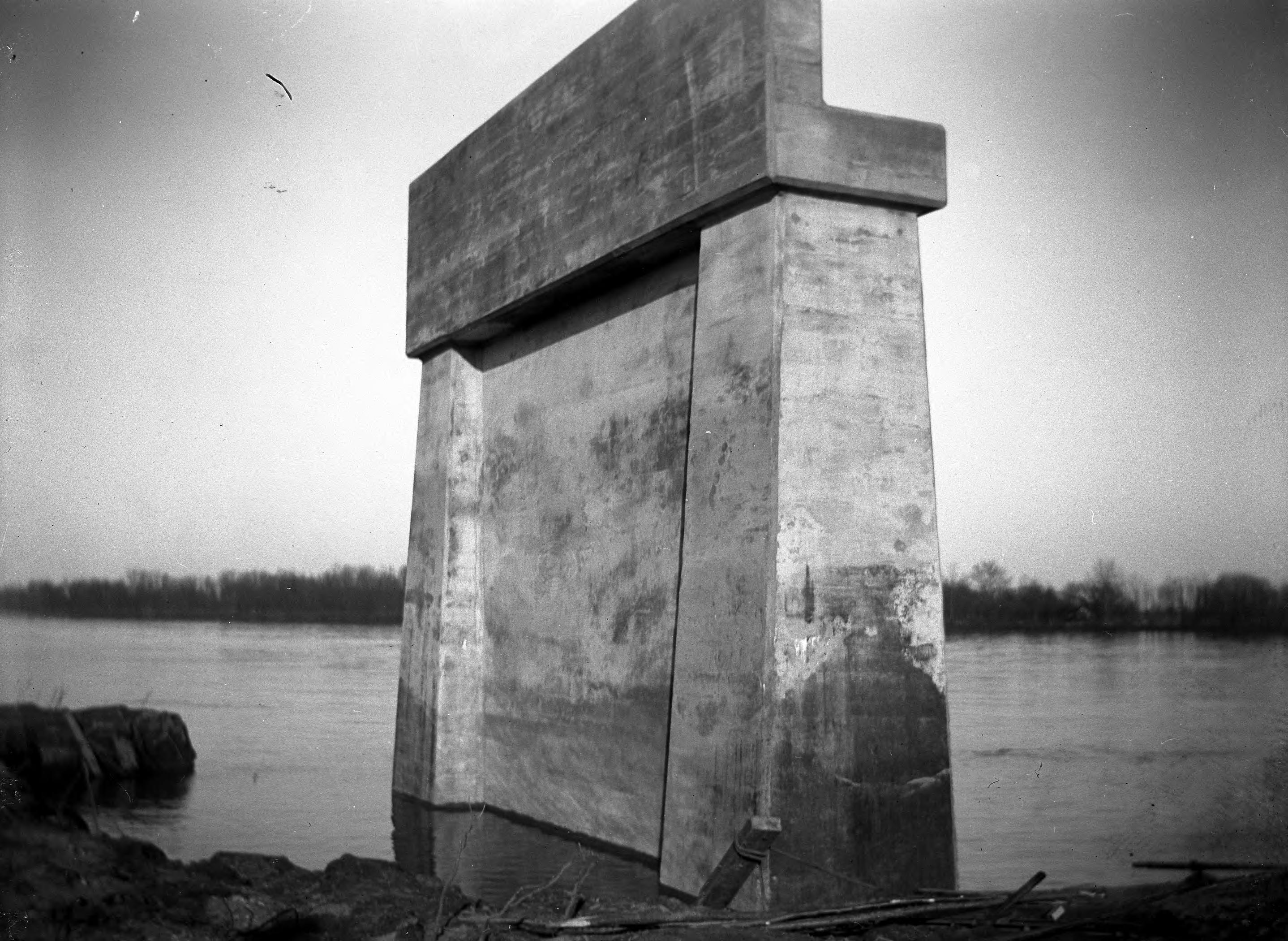 Harmony Way Bridge construction, showing the pier on the Illinois side of the Wabash River after floodwater washed the bank away. Until the Harmony Way bridge between Posey County, IN and White County, IL was built in 1930, a ferry would have been the only means of access. This bridge is now closed due to being structurally deficient, and lack of funding to effect repairs.