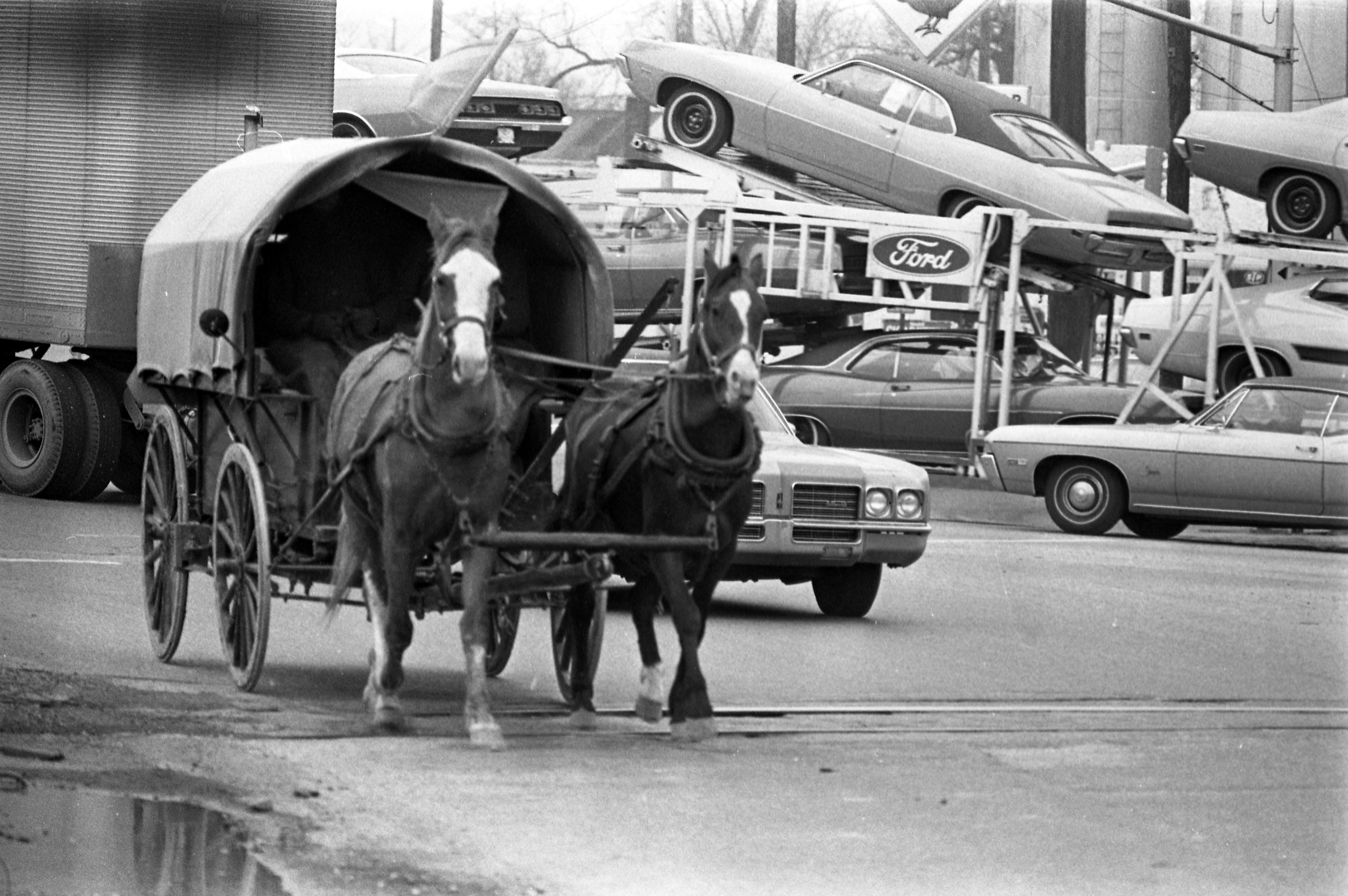 Two horses pulling a covered wagon through Evansville. The location (as determined from MSS 228-1020) seems to be on N. Kentucky Ave., just north of what was then Division St. There is heavy street traffic around them.