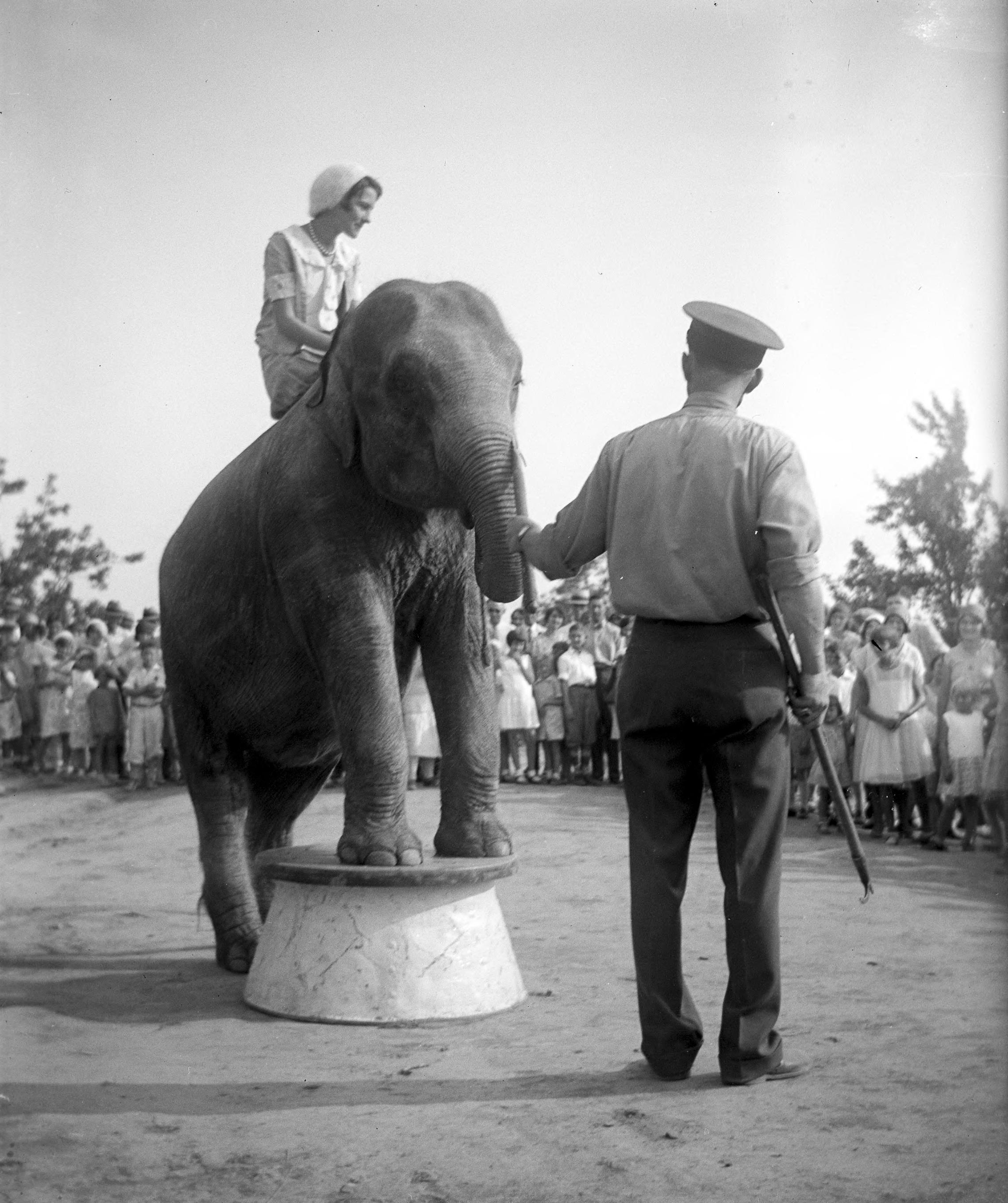 Leon Smith, the trainer, and Kay the elephant at Mesker Park Zoo. Atop Kay is Juanita Israel. Cartoons from Karl Kae Knecht graced the pages of the Evansville Courier from 1906-1960. In addition to being a prolific and influential cartoonist and later photographer, Knecht was very civic minded and loved circuses.""In 1928, Knecht helped found Mesker Park Zoo. This occurred after the president of the American Circus Corporation offered Knecht a pair of lions. A year later, Knecht bolstered the fledgling zoo--Indiana�s first--with a successful fund drive to purchase an elephant for the new facility. The elephant, Kay, was named in honor of Karl Kae Knecht." (https://evansvillemuseum.org/events/pen-paper-remembering-karl-kae-knecht/).