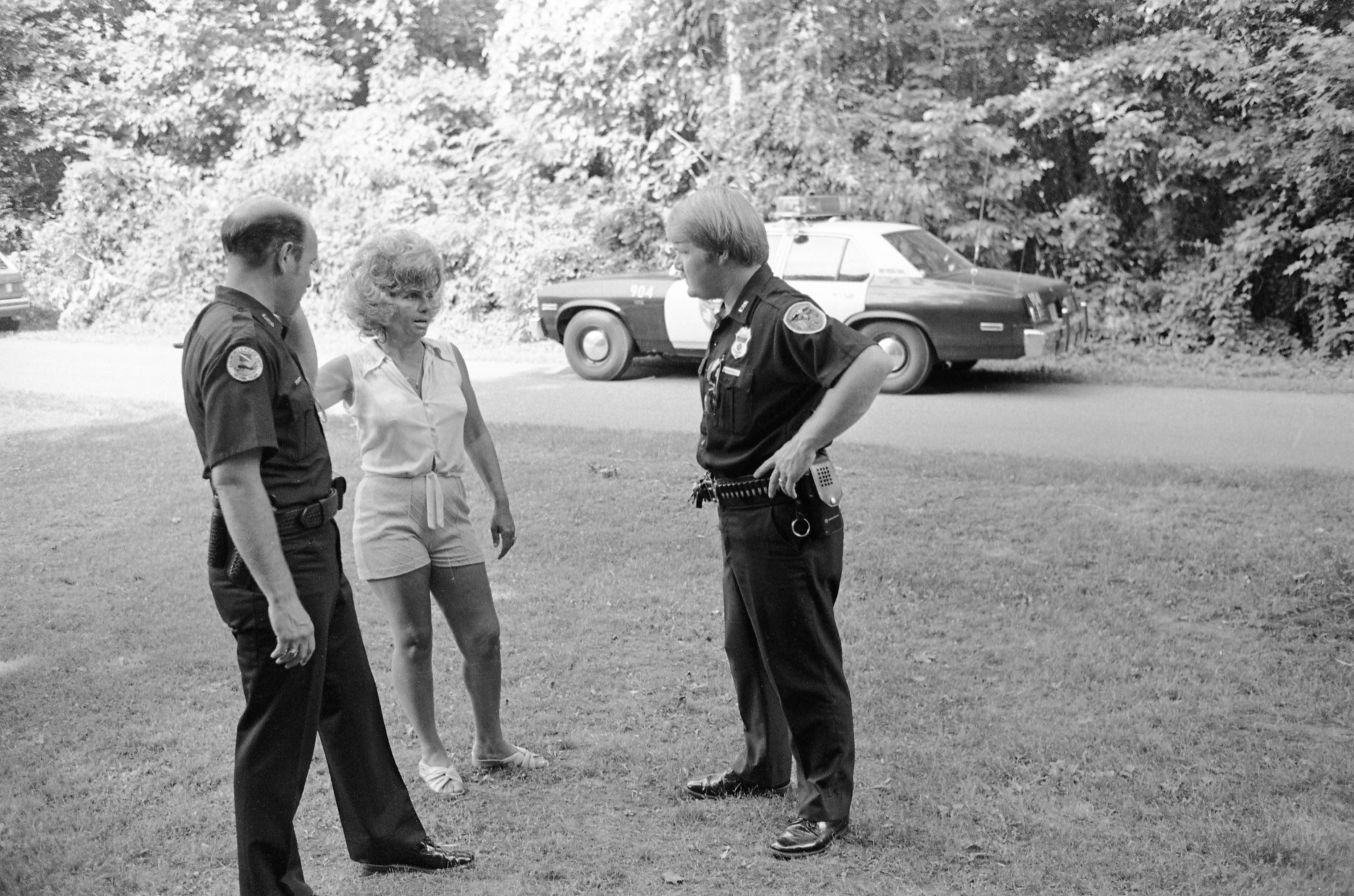 Two Evansville police officers talking to a woman near their cruiser (#904), in a woody area, possibly a park