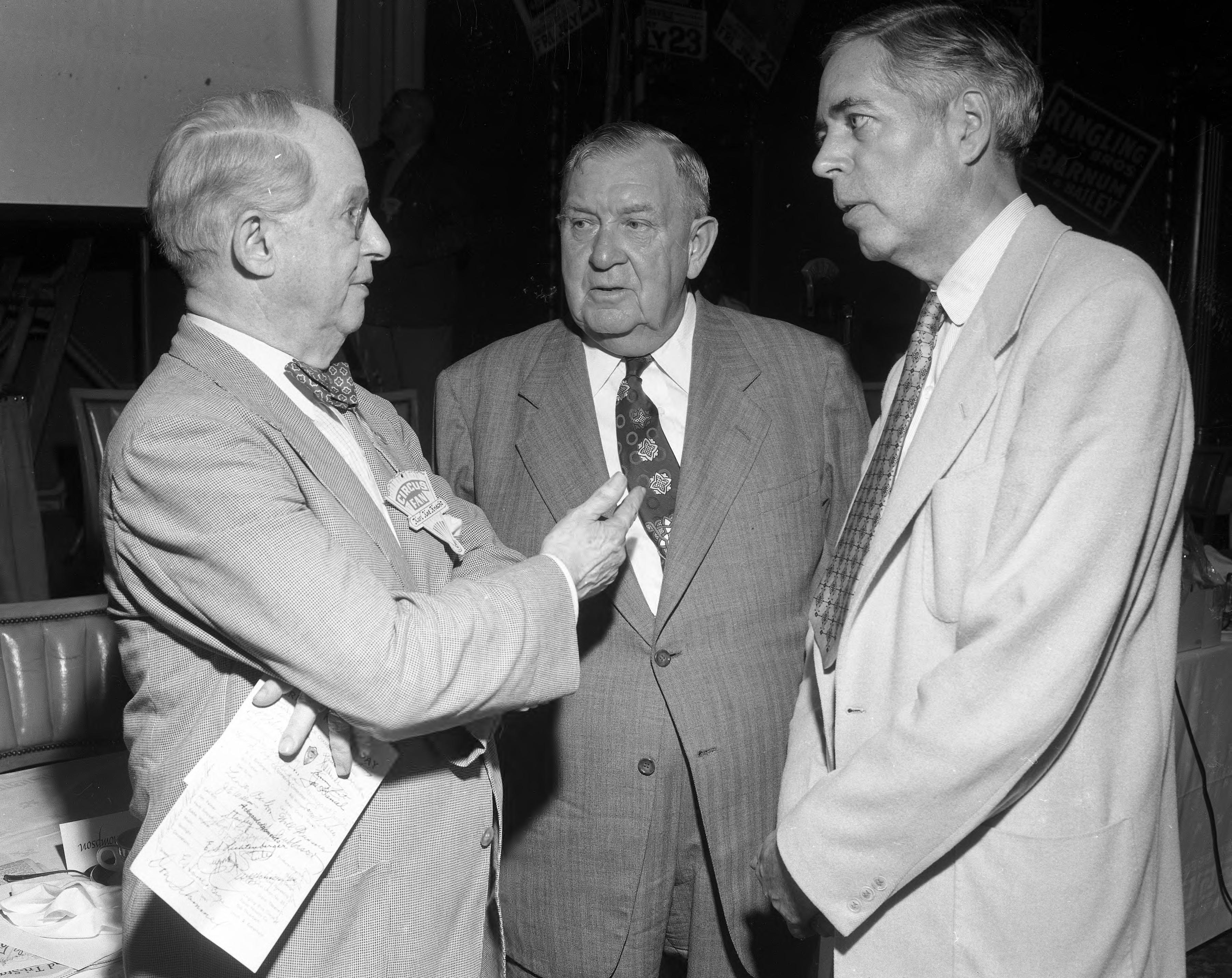 Reception for Karl K. Knecht, honoring him for being the oldest, in terms of service, cartoonist in the country. Karl Kae Knecht was a cartoonist, columnist, and photographer for the Evansville Courier 1906-1960. The reception was held in the Empire Room of the Vendome Hotel at 24 NW 3rd St. Here Knecht is speaking to Ringling Bros. circus assistant vice president Ed Kelley (center) and its press agent, Beverly Kelley.