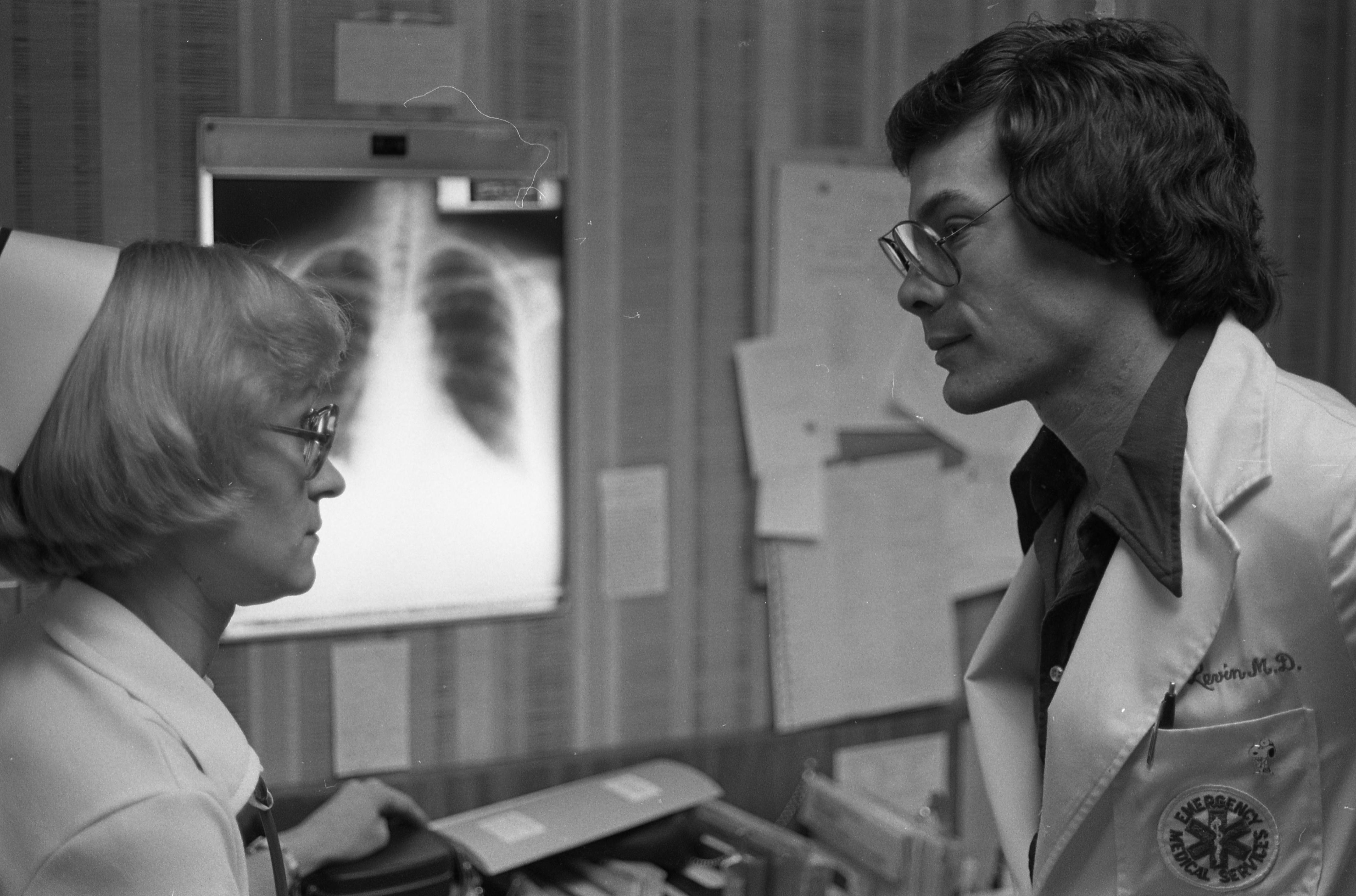 Dr. [John] Levin (first name cannot be verified), an emergency services physician, speaking to a nurse at Deaconess Hospital at 600 Mary St.
