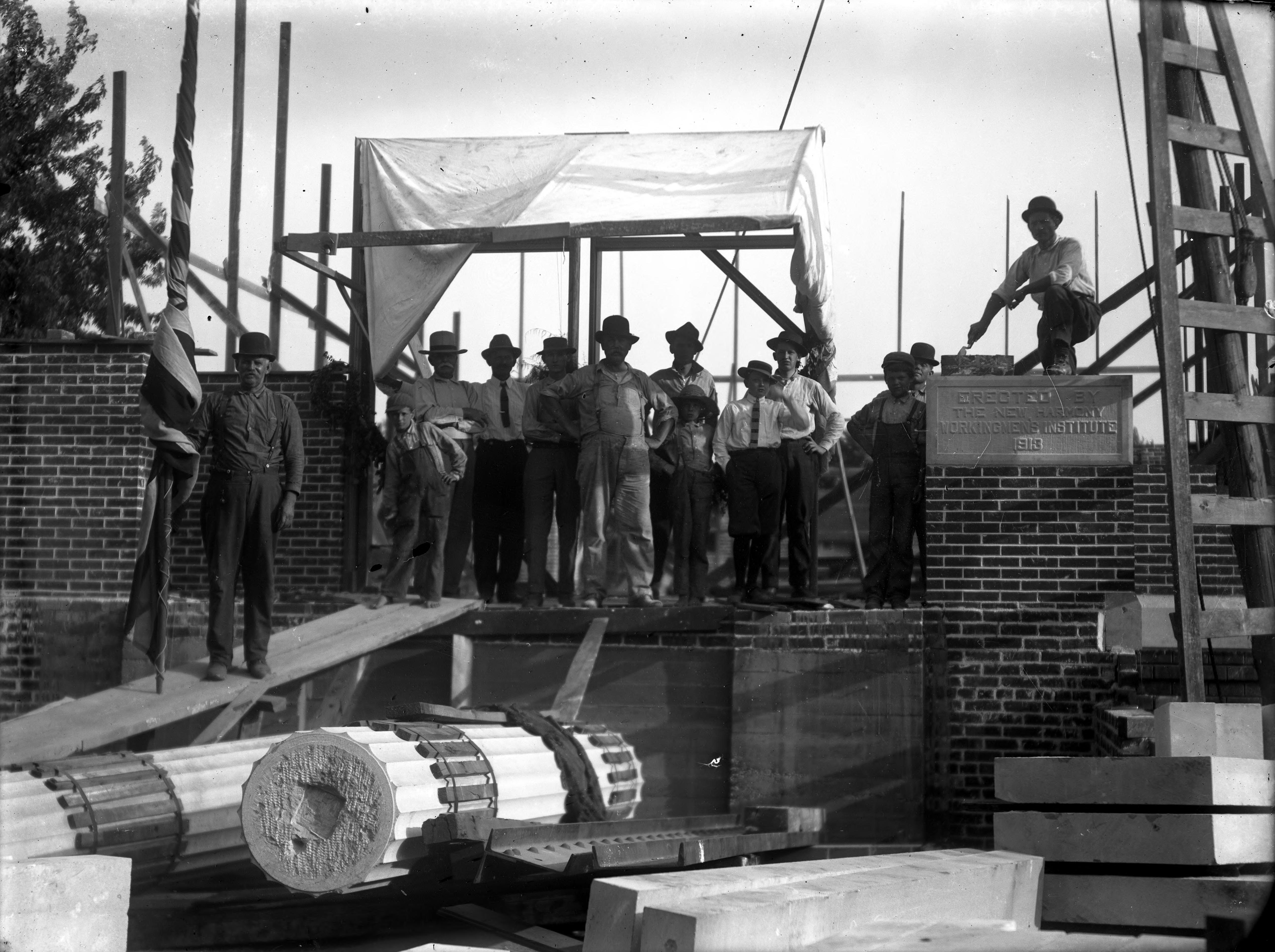 Construction of Murphy Auditorium at 419 Tavern St.""In 1911, the Working Men�s Institute purchased a lot adjacent to their museum and library with the purpose of building an auditorium. This project was funded through the Dr. Edward Murphy fund. Today, the University of Southern Indiana�s Murphy Auditorium offers excellent space for conferences, concerts, lectures, and is home to the University�s New Harmony Theatre Summer Season." (https://visitnewharmony.com/celebrate/murphy-auditorium/).