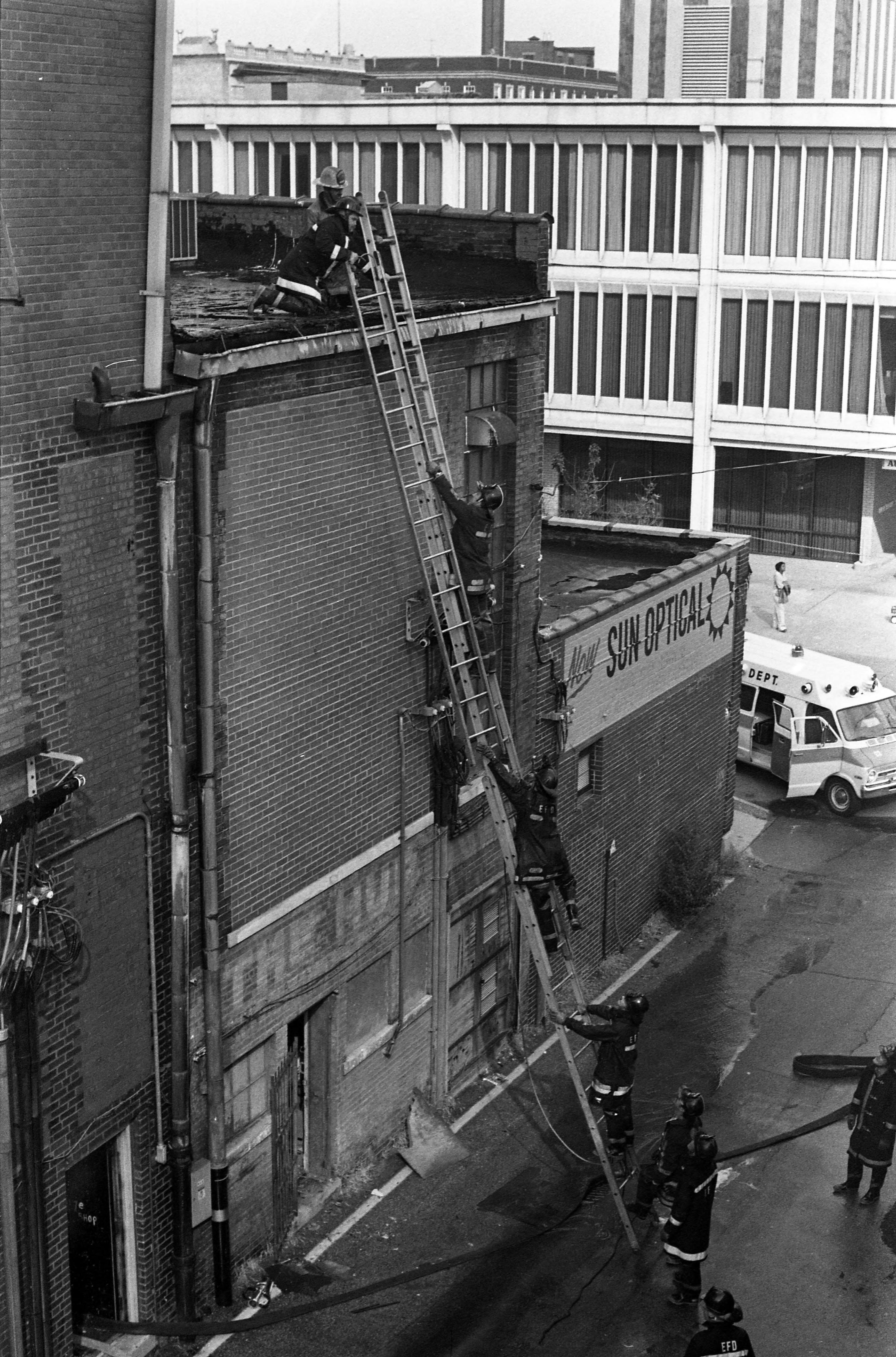 A 3-alarm fire destroyed the Luggage Shop fire at 423 Main St. on a Sunday morning. In all, 140 firefighters, 8 pumper trucks, and 3 snorkel trucks labored for about 3.5 hours to put out the fire that had started on the 3rd floor. The fire was attributed to a malfunctioning gas line that caused the boiler to overheat. No one was injured. Here firefighters approach the fire from the alley that runs alongside the block where the fire was. Across the street is Old National Bank at 420 Main St.