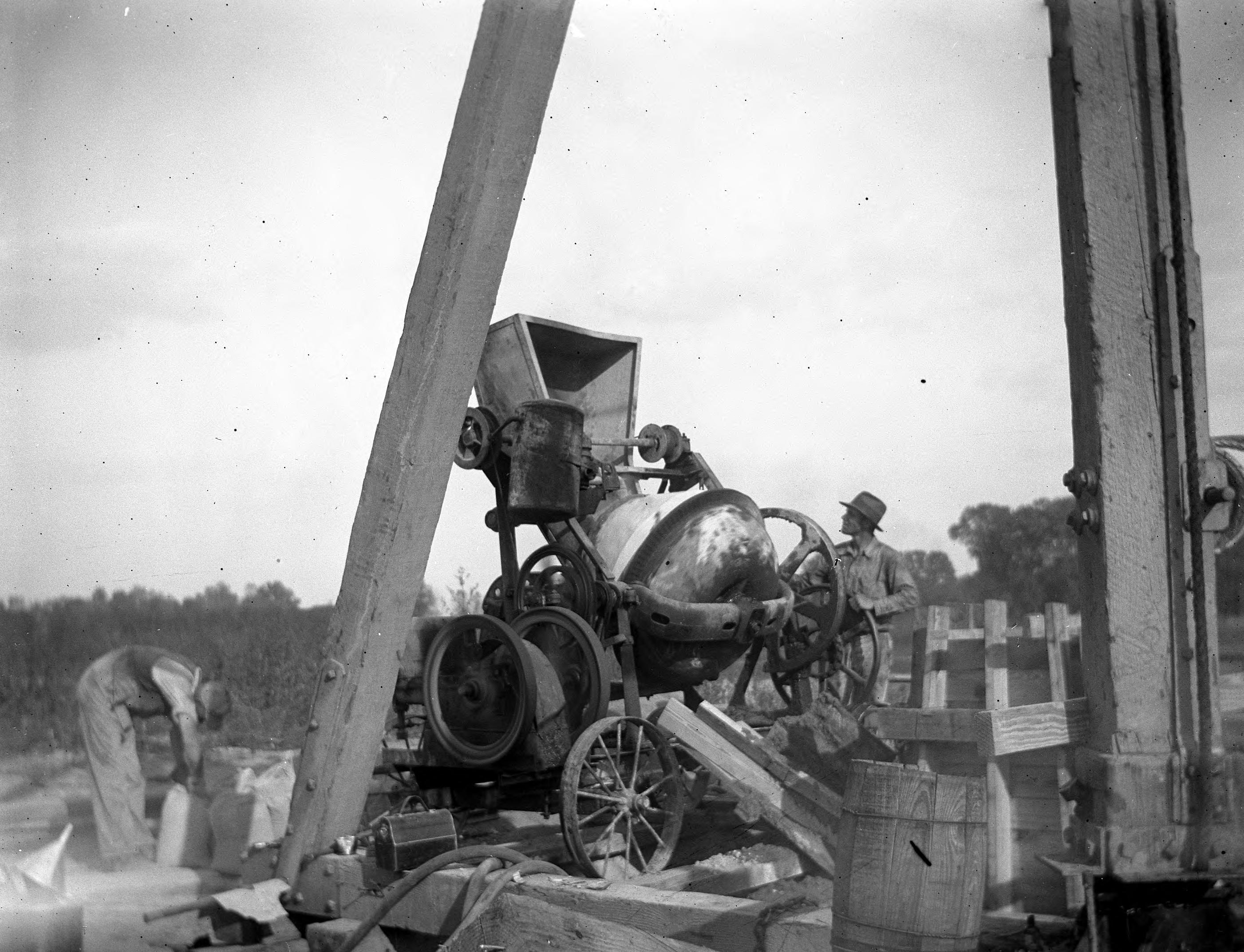 Harmony Way Bridge, Dick Dunn pouring concrete in the new pier on Illinois side of the Wabash River. Until the Harmony Way bridge between Posey County, IN and White County, IL was built in 1930, a ferry would have been the only means of access. This bridge is now closed due to being structurally deficient, and lack of funding to effect repairs.