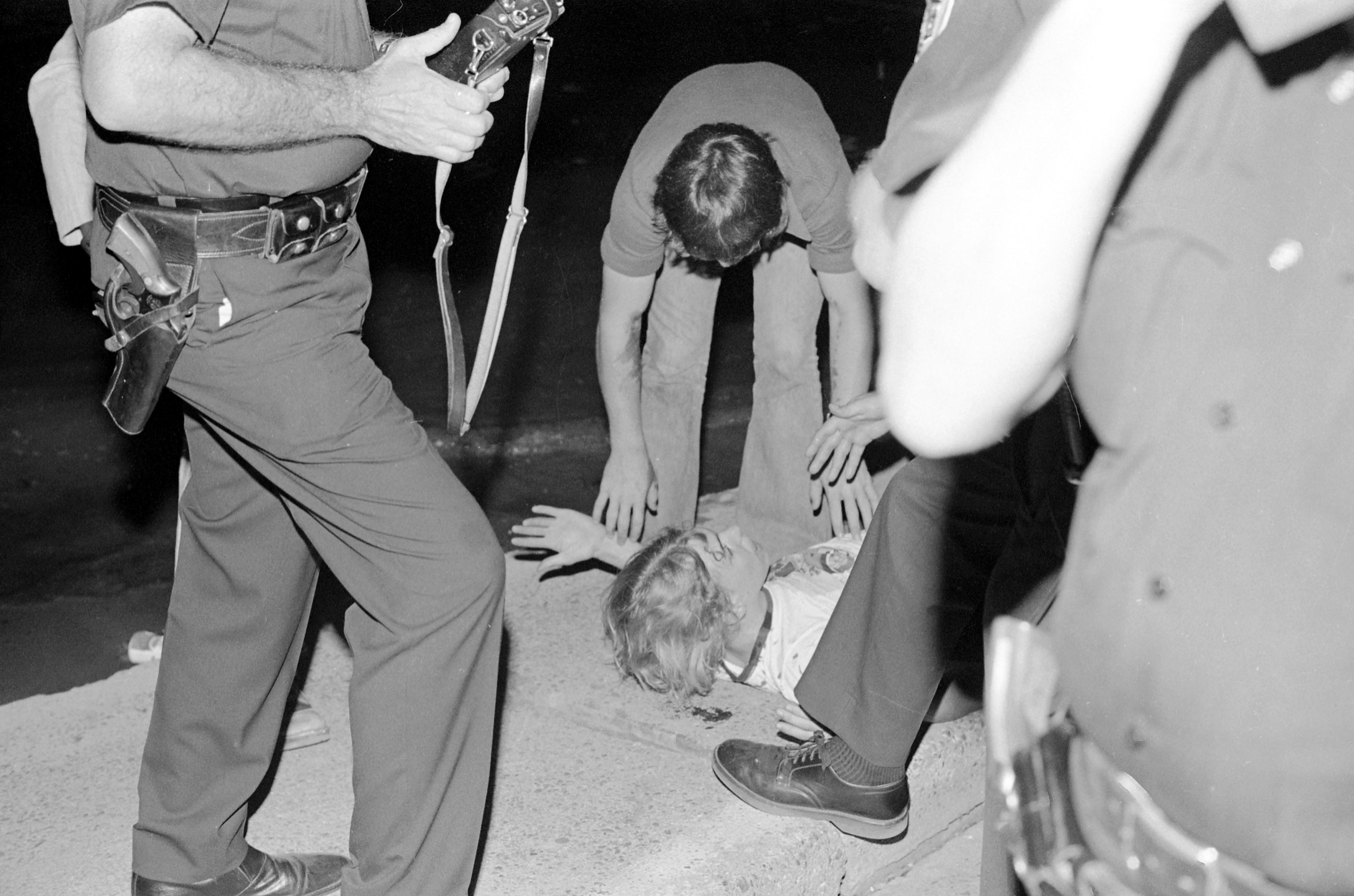 Police officers leaning over a teenage boy lying on the ground