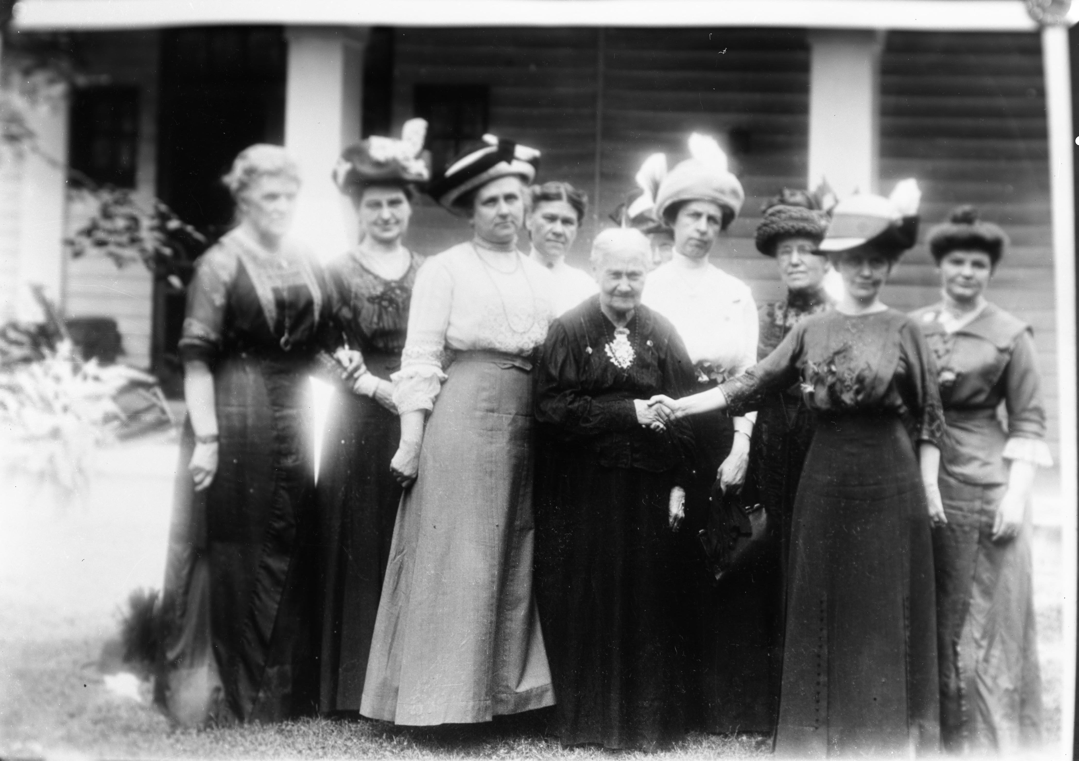 Group at old Fauntleroy home, from left to right: Mrs. Lucy White Williams/Laput, MI, Mrs. Frances D. Evert/Highland Park, IL, Mrs. Harry L. Kelfe/Walthill, NE, Miss Mary Emily Fauntleroy/New Harmony, Mrs. Rachel Homer Fauntleroy/New Harmony, Mrs. Grace Julian Clarke/Indianapolis, IN, Mrs. Della Owen/New Harmony, Mrs. Percy V. Pennybacker/Austin, TX, and Mrs. J C. Mathews/New Orleans, LA. The occasion is unknown.