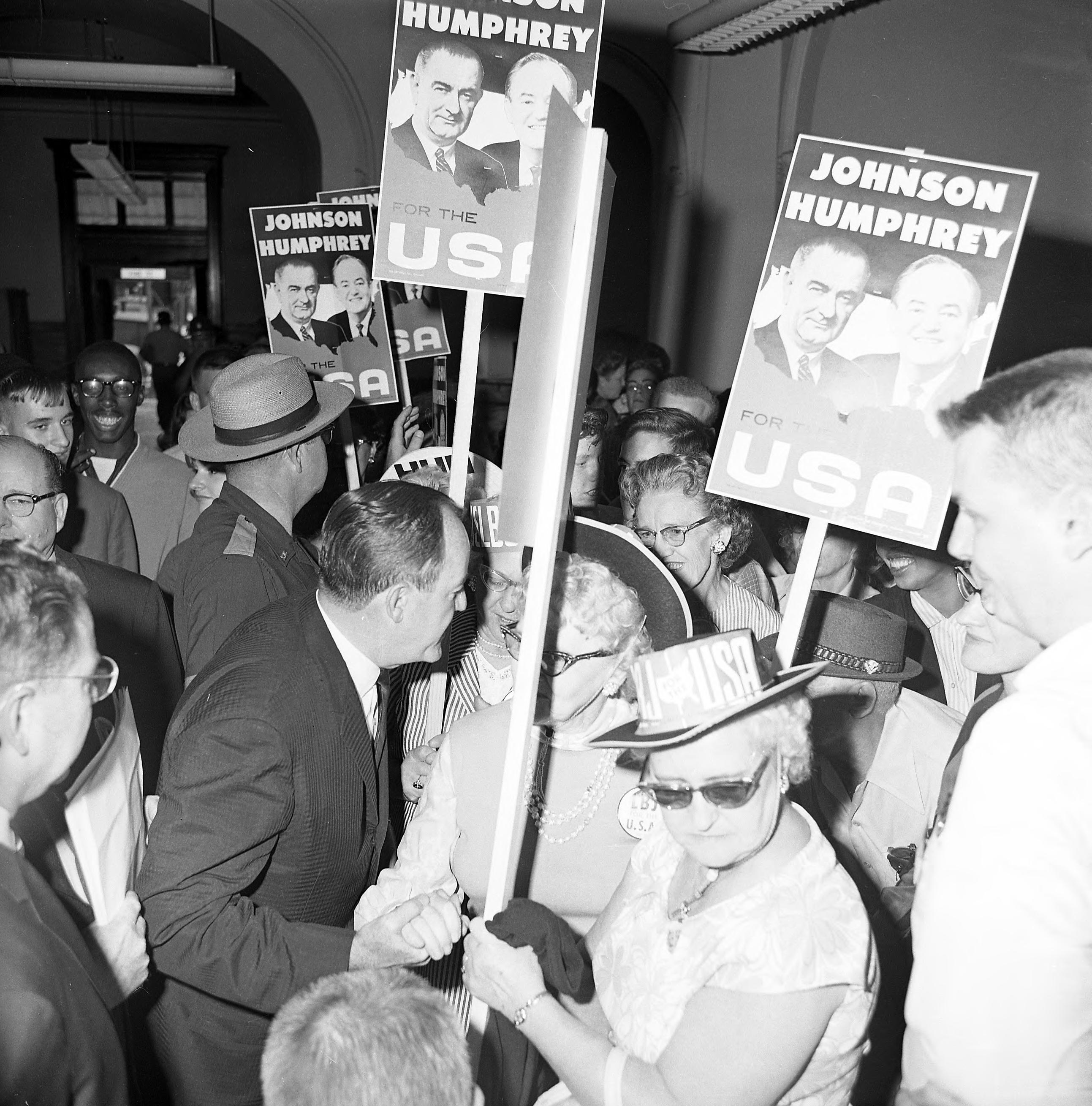 In 1964 then Senator Hubert Humphrey was in Evansville as the vice-presidential nominee on the ticket with Lyndon B. Johnson for president. Here he is greeting supporters inside the courthouse. Just visible in the left foreground is Indiana Senator Vance Hartke.