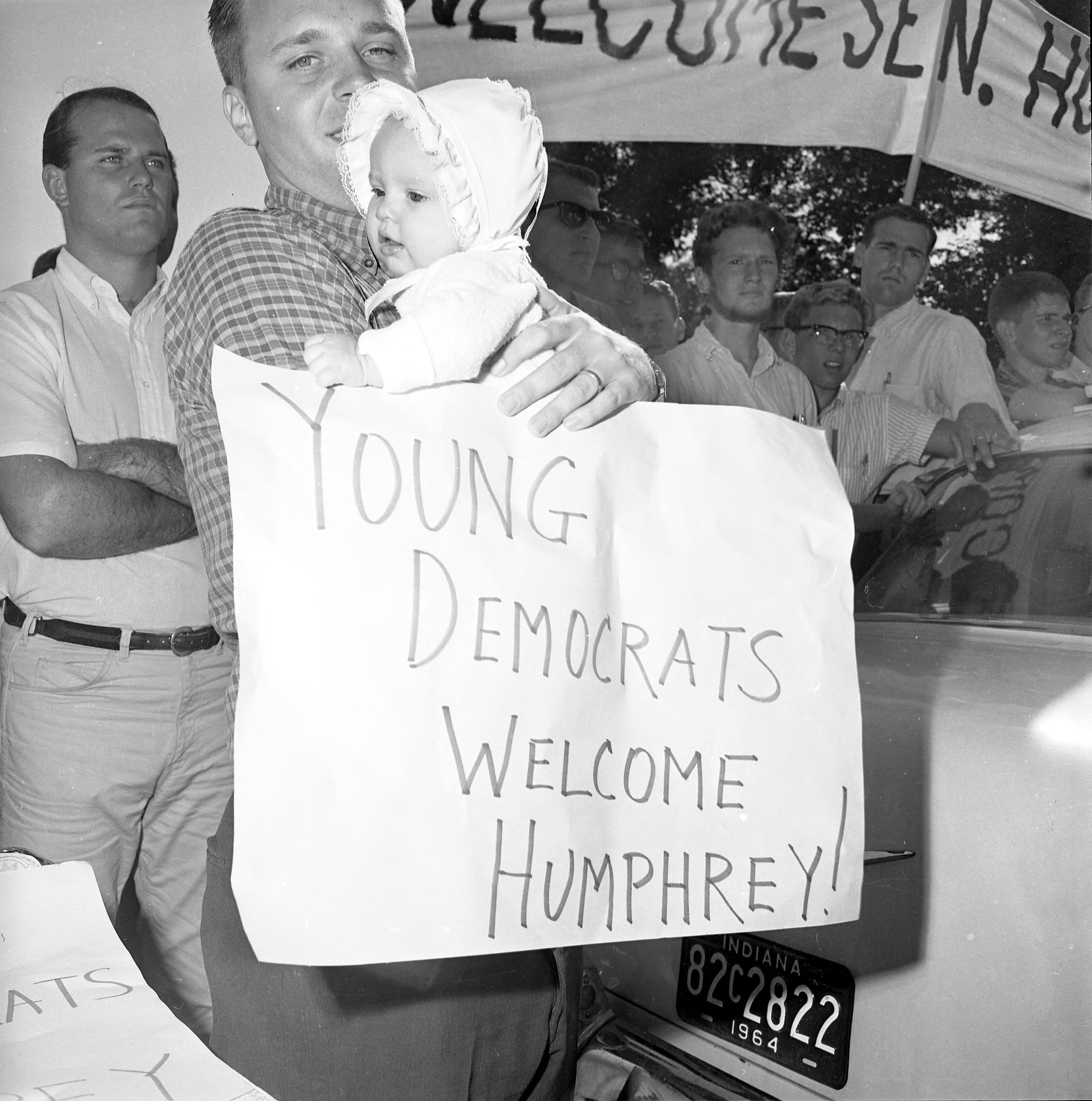 In 1964 then Senator Hubert Humphrey was in Evansville as the vice-presidential nominee on the ticket with Lyndon B. Johnson for president. Here, a father holds a little baby and a sign that says,""Young Democrats Welcome Humphrey!"