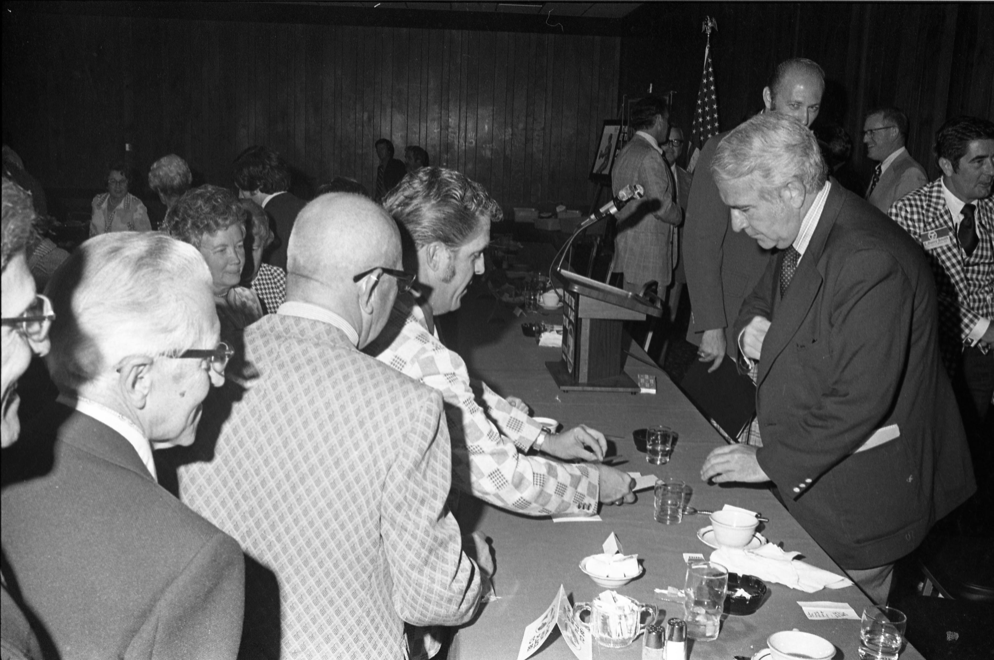 Harry Reasoner was in Evansville to dedicate the new building of the local ABC affiliate, at that time, WTVW, Channel 7. He also spoke to a joint luncheon of 6 civic clubs (Rotary, Kiwanis, Optimist, Civitan, Lions, and Exchange) at the Executive Inn at 600 Walnut St. The photograph here was taken at the luncheon. Here Reasoner speaks to some attendees.