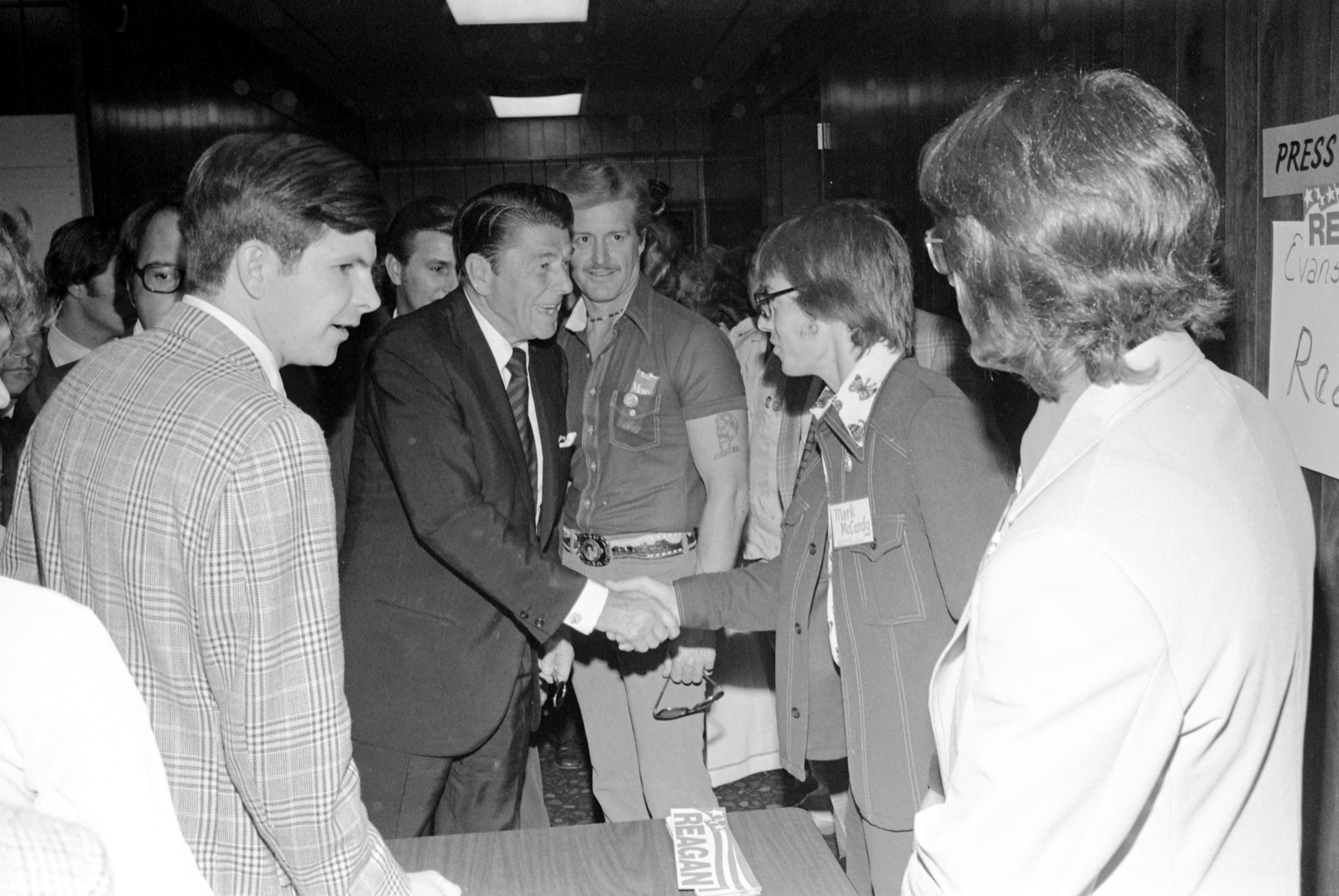 Ronald Reagan shaking hands with supporters, on the campaign trail in the 2nd of his 3 attempts to win the U.S. presidential nomination. He is shaking hands with Mark McCurdy, and to McCurdy's left is Jon Dauble.