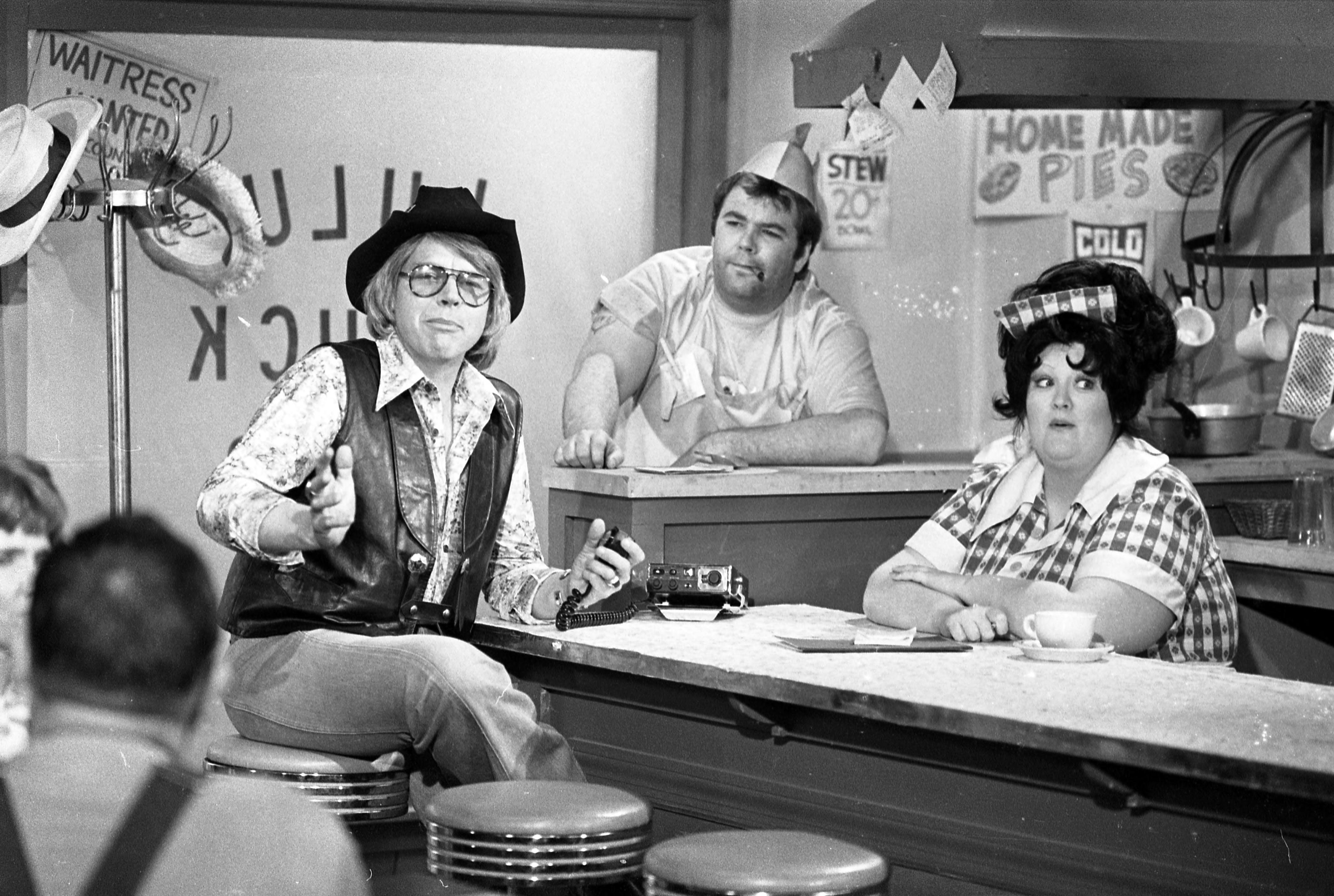Evansville Courier photographer Sonny Brown was a friend of Hee Haw cast member Grandpa Jones, who was born in Niagara, KY (in Henderson County---just across the river from Evansville, IN) and thus was able to visit the set and take lots of backstage photographs. Here are 2 unknown actors and Lulu Roman in a skit that took place in ""Lulu's Truck Stop."