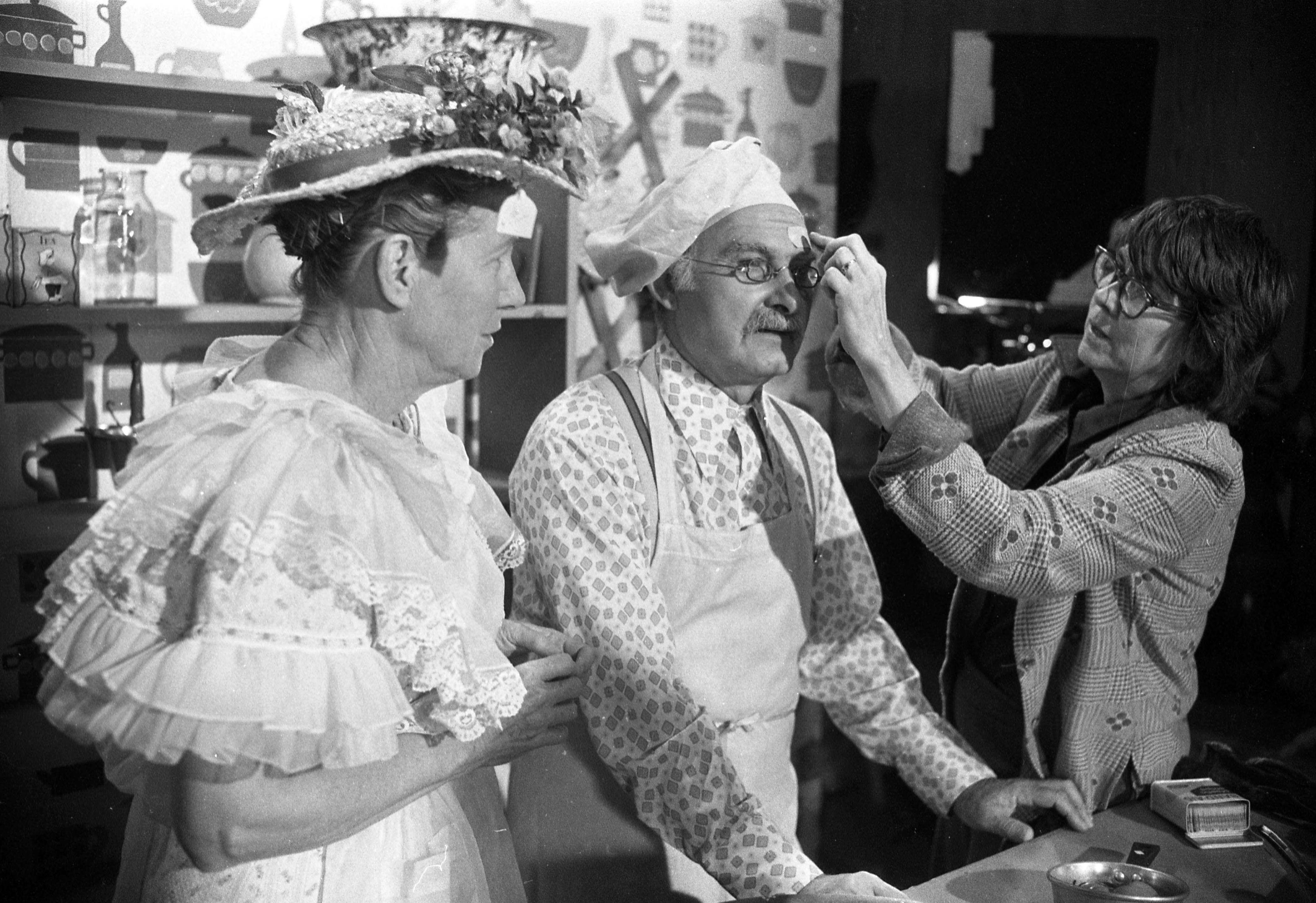 Evansville Courier photographer Sonny Brown was a friend of Hee Haw cast member Grandpa Jones, who was born in Niagara, KY (in Henderson County---just across the river from Evansville, IN) and thus was able to visit the set and take lots of backstage photographs. Here are Minnie Pearl and Grandpa Jones, with Jones being attended by a makeup artist.