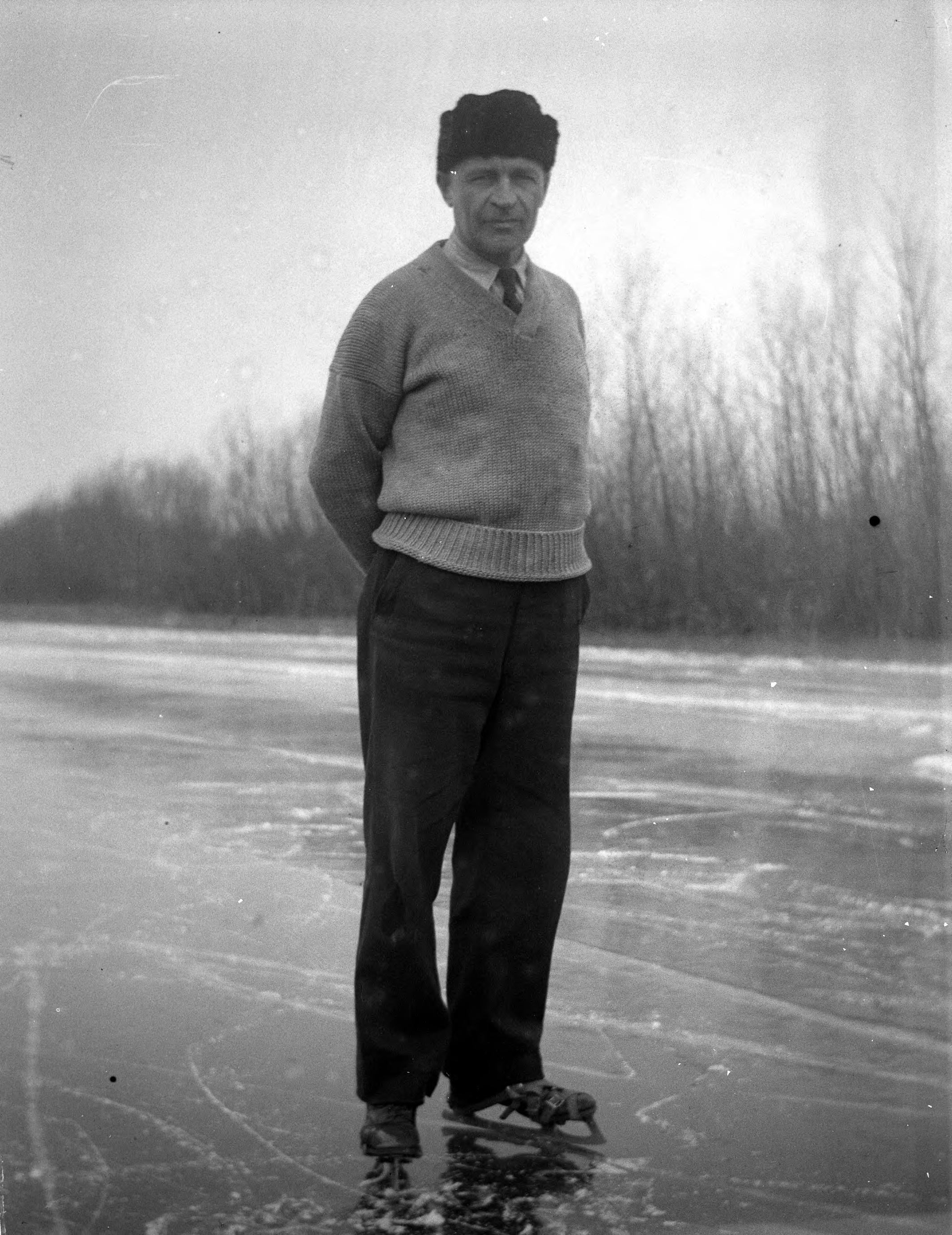 Wilbur Pelham ice skating on the Wabash River just above the bridge."" The Pelham family connection with New Harmony begins with William Pelham, 1759-1827. Born in Williamsburg, VA, he was a surgeon in the Revolutionary War. From Zanesville, Ohio, where he was postmaster and editor of the Ohio Republic, he came to join the Owen community early in 1825. His letters of this time are preserved and reflect his interest and enthusiasm in the experiment. He served as editor of the New Harmony Gazette. When he died in 1827, the community was tottering, but his belief in the ideals on which it was based never wavered." (http://workingmensinstitute.org/the-pelham-collection/) Wilbur is believed to be the great great grandson of this doctor.