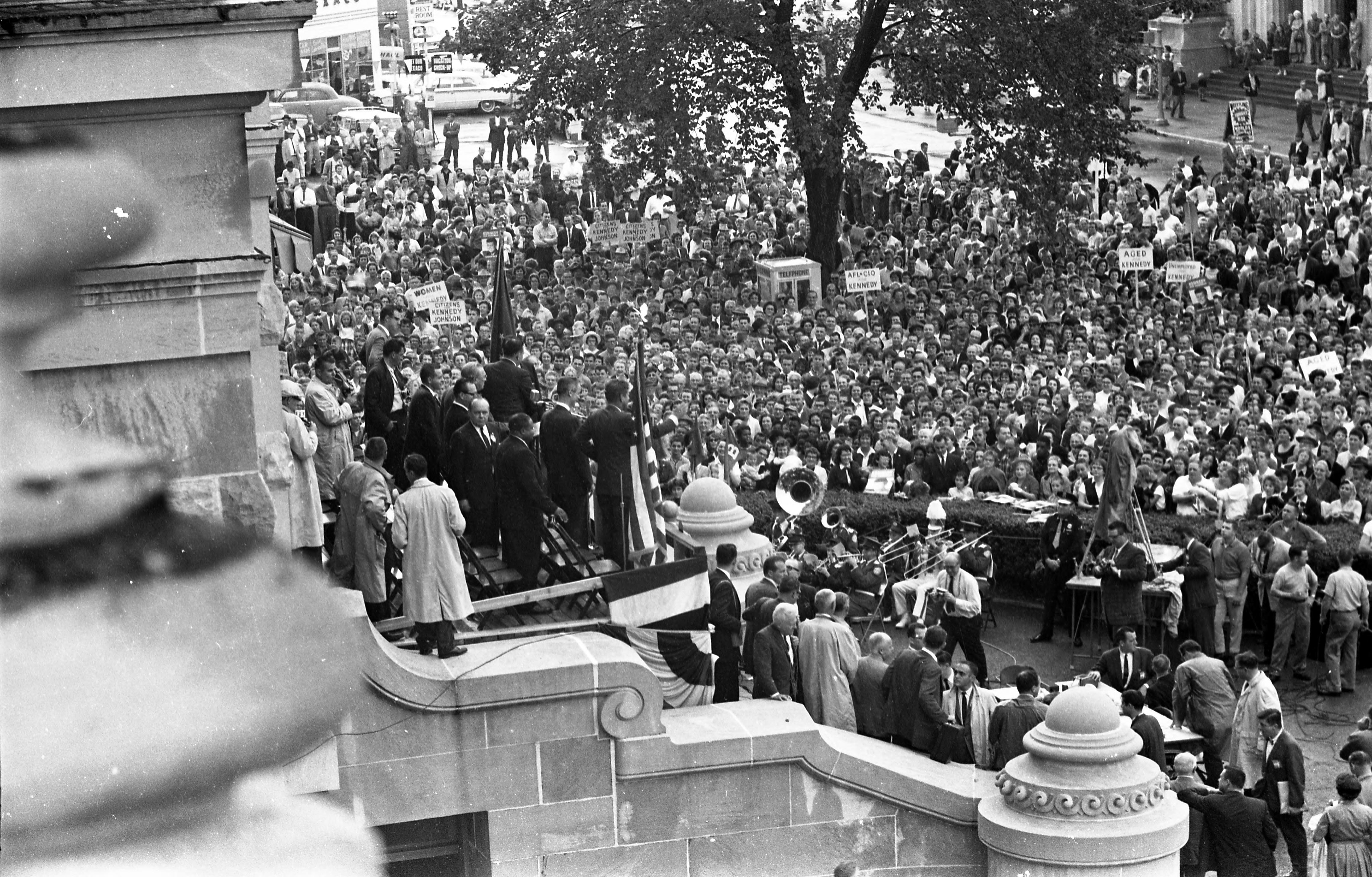 Crowd listening to Senator John F. Kennedy of Massachusetts as he campaigned for the U.S. presidency. He spoke from the Vanderburgh County Courthouse (210 NW 4th St." the Court St. side steps. This building still stands, but no longer serves as a courthouse. It is now referred to as the old courthouse. Next to Kennedy is Matthew E. Welsh, candidate for Indiana governor. Behim them (the man partially facing the camera) is Evansville Mayor Frank F. McDonald.
