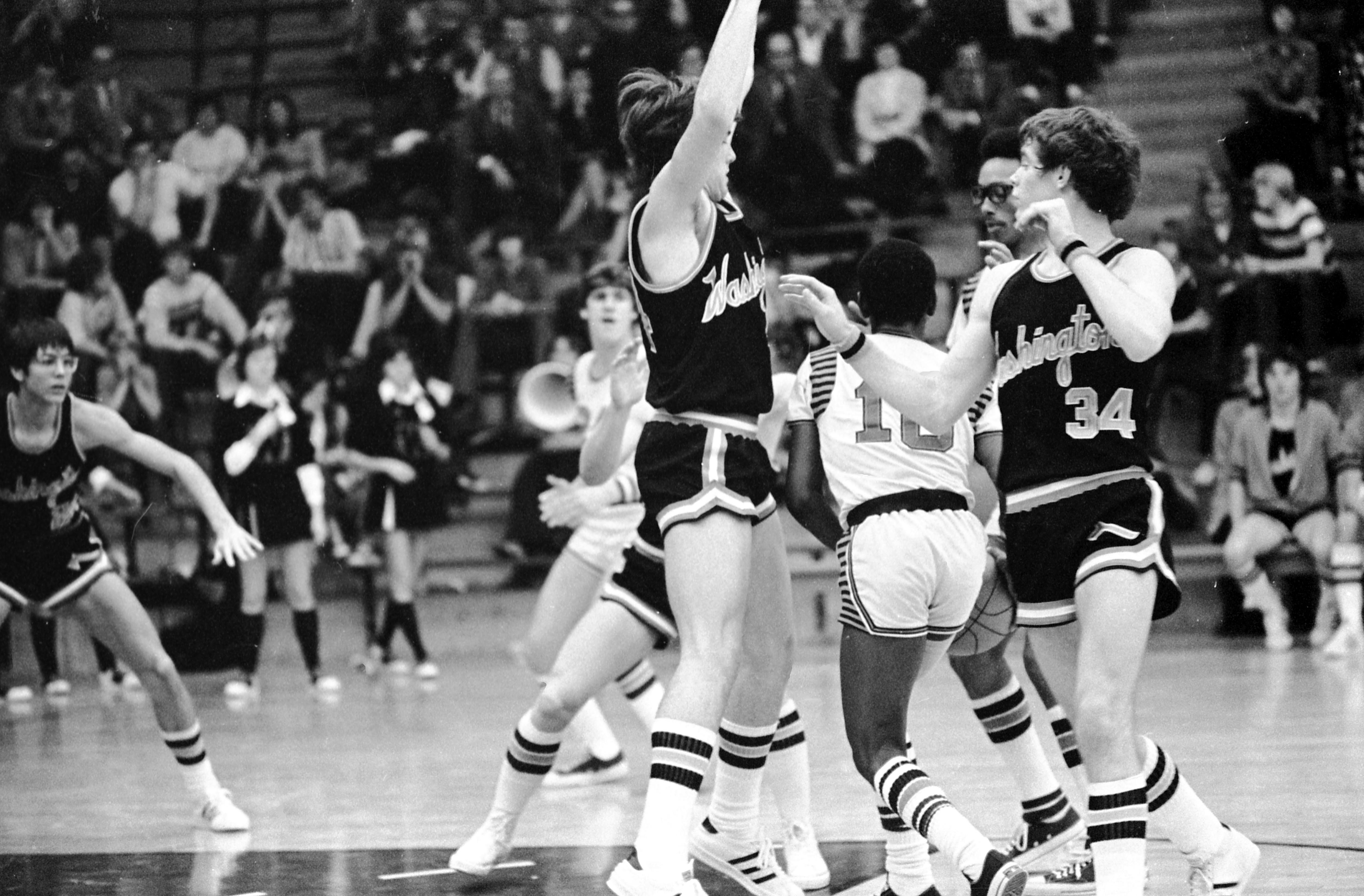 Basketball game, with one team's uniform saying Washington. The other team's identity is unknown, and it is unclear if this is high school or college. The seating does not look like bleachers, so this is possibly Roberts Municipal Stadium at 2600 Division St. This facility was razed in 2013.