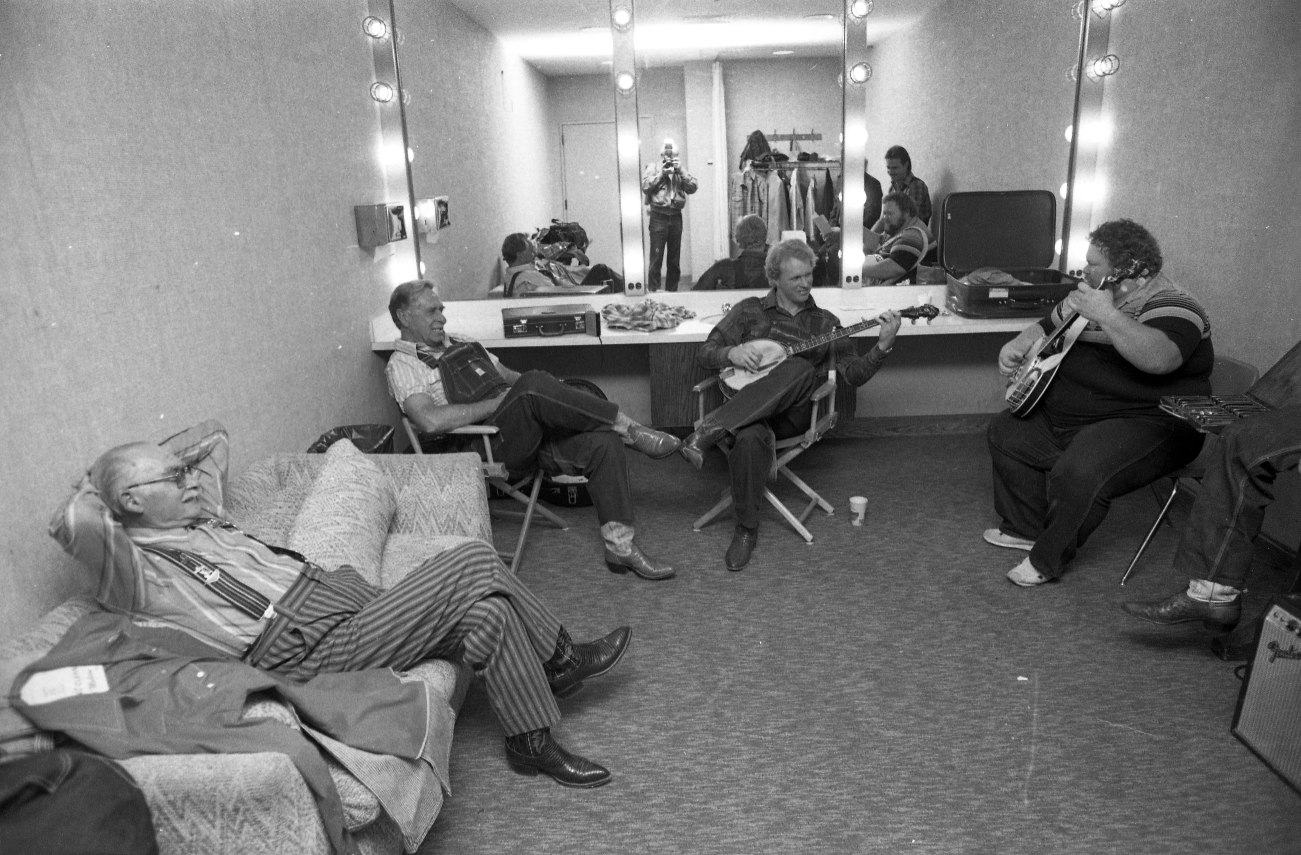 Evansville Courier photographer Sonny Brown was a friend of Hee Haw cast member Grandpa Jones, who was born in Niagara, KY (in Henderson County---just across the river from Evansville, IN) and thus was able to visit the set and take lots of backstage photographs. Here are Grandpa Jones and other cast members, in a dressing room.