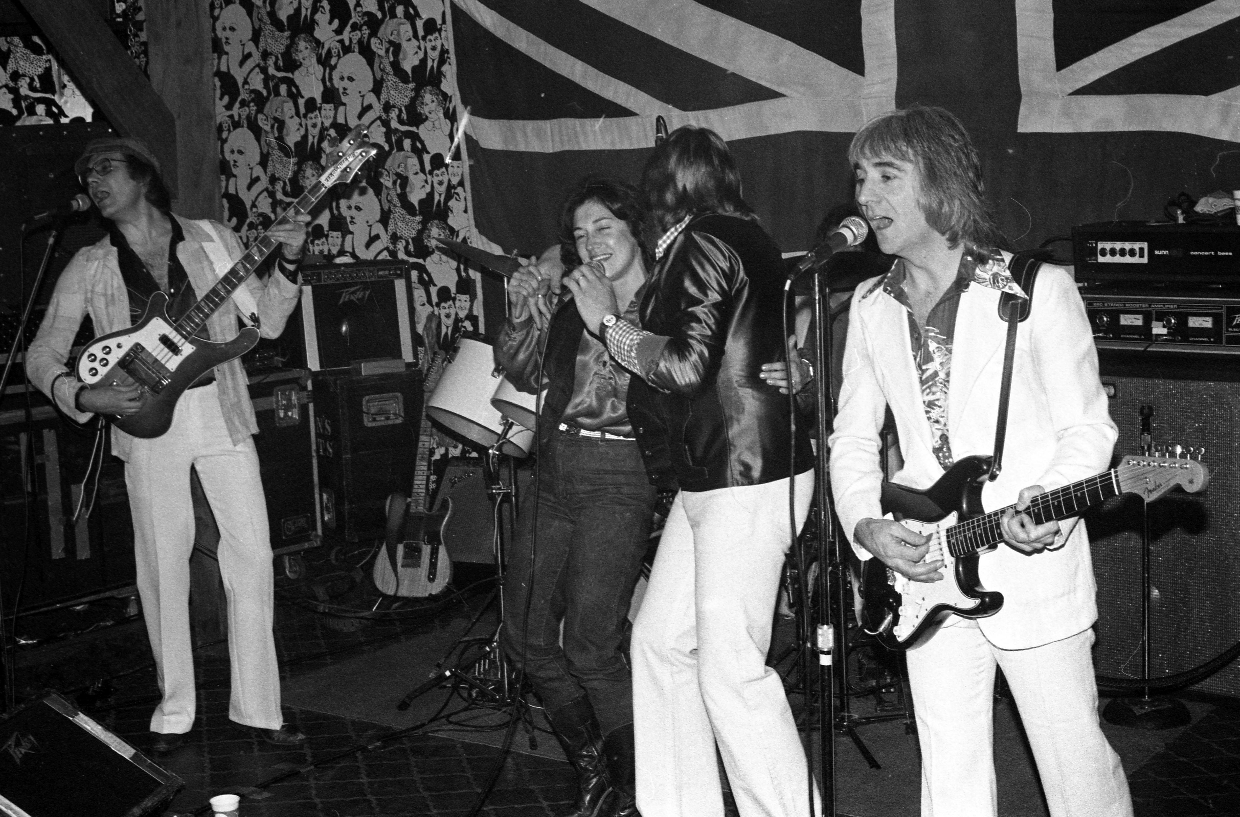 Unidentified band, with a British flag backdrop, playing in a nightclub-like setting