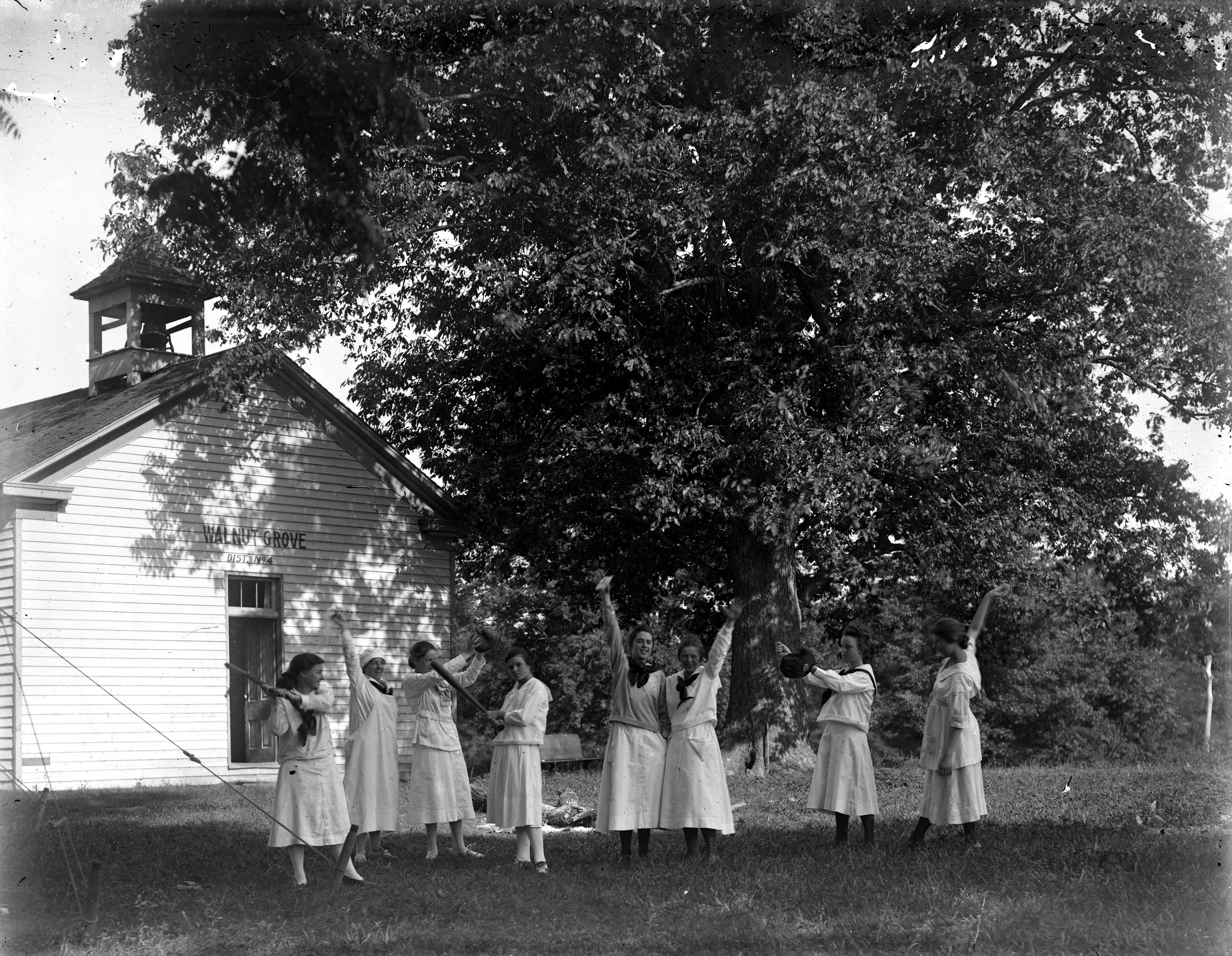 Walnut Grove District No. 4 schoolhouse with young women playing ball.