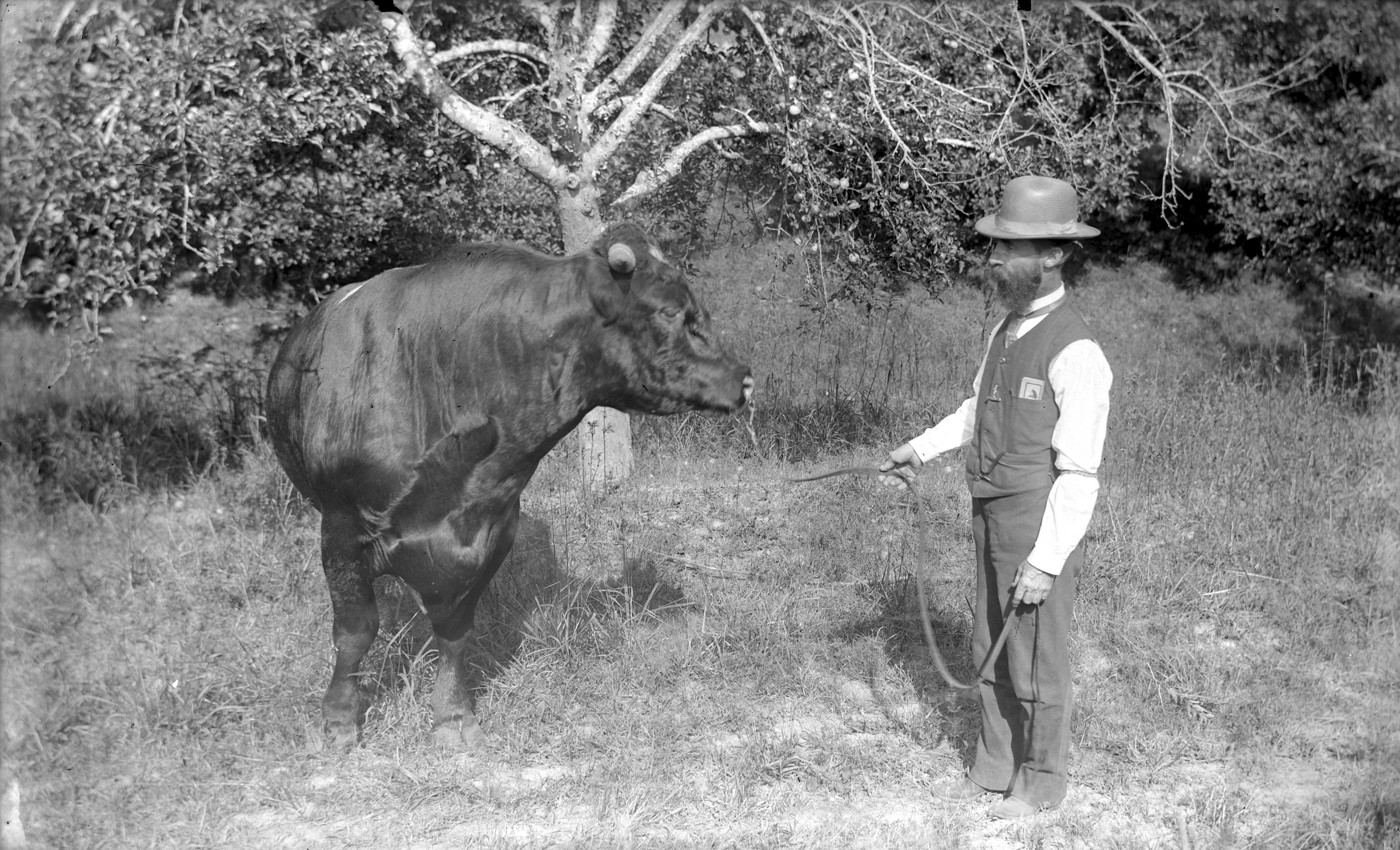 E. F. (Eugene Fellenberg) Owen with bull. He was the son of Richard and Anna Neef Owen, and thus grandson of Robert Owen. He ""received his education in the United States. He became a farmer and raised stock. He studied the pedigrees of his cattle scientifically as he did other things in which he was interested. He was a dreamer, however, and note a good business man. Easy, generous and confiding, like most of the Owens, he lost much money in various ventures, some in a land scheme in Oklahoma. He was an officer in the United States army during the Civil war. He was always deaf and this increased with age. He married Della Mann and lived in New Hamony all his life. His death occurred in 1905." (https://scholarworks.iu.edu/journals/index.php/imh/article/view/6280/6276).
