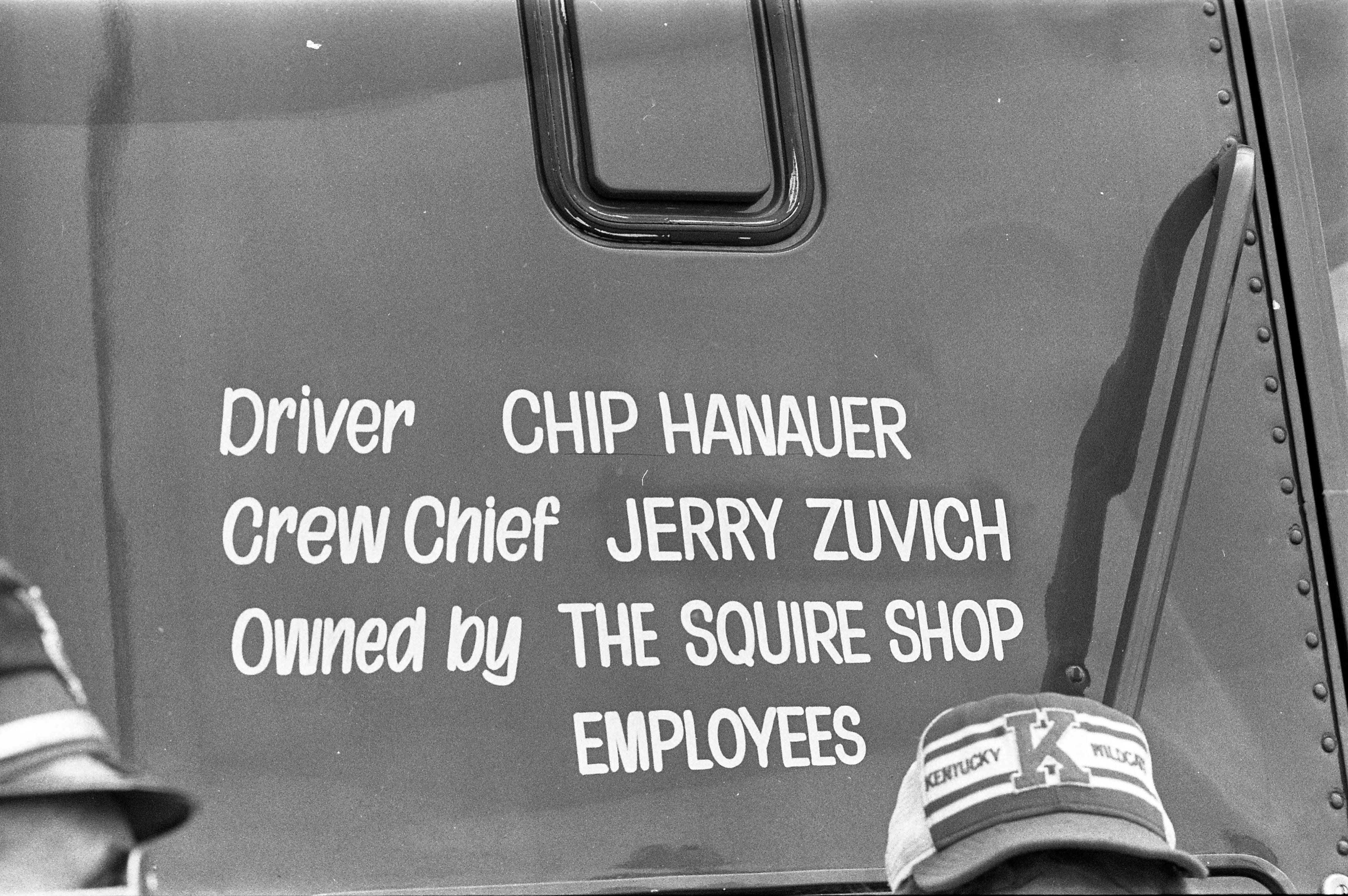 Thunder on the Ohio hydroplane races. Close-up photograph of the truck cab that towed the Squire Shop boat, listing its driver (Chip Hanauer), crew chief (Jerry Zuvich), and owner (The Squire Shop Employees.)