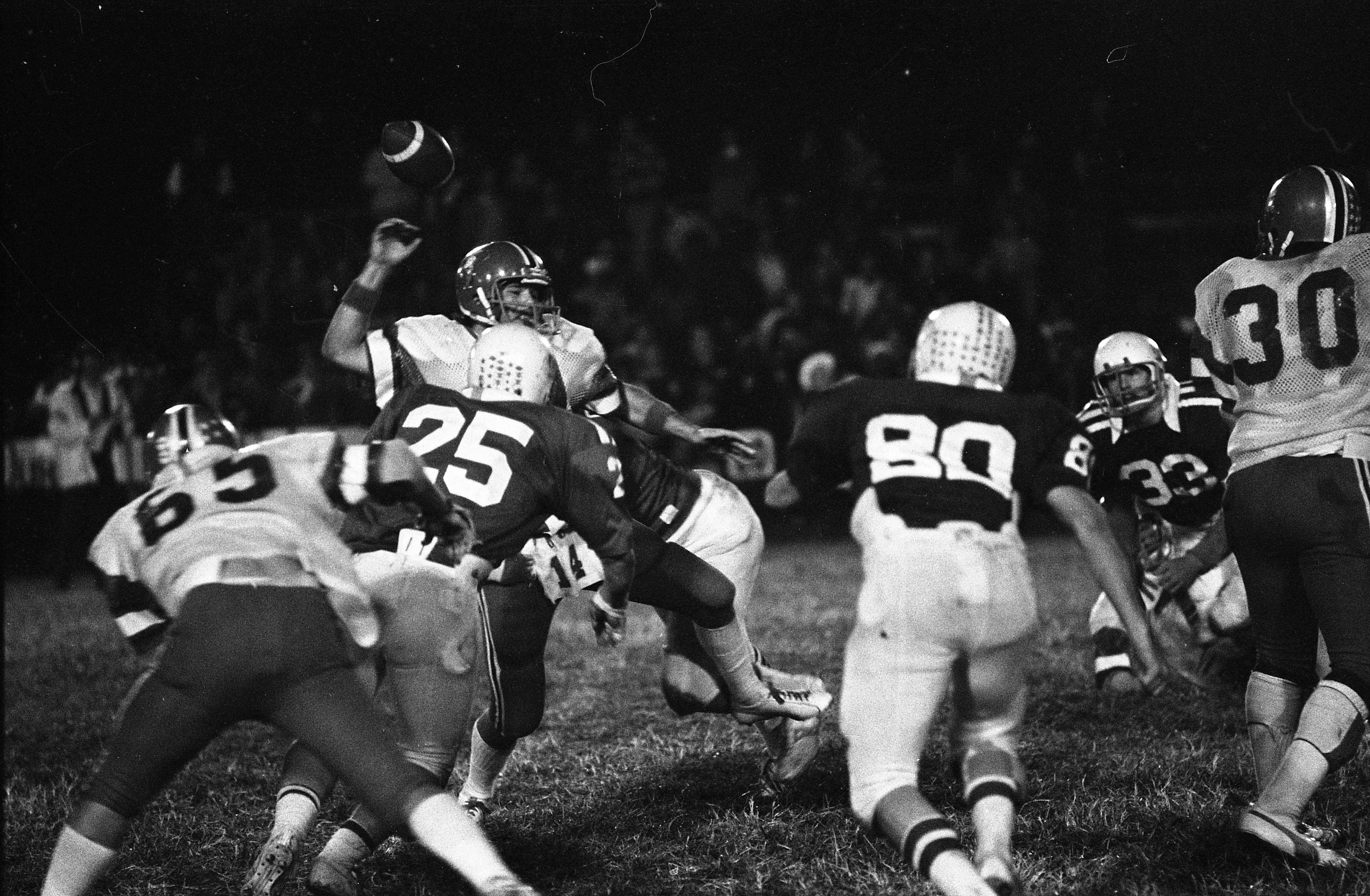 Unidentified teams in a football team, with the quarterback being tackled. The team with the darker jerseys has what looks like an HC on the sleeve---if this is high school, then that possibly could be Henderson County.