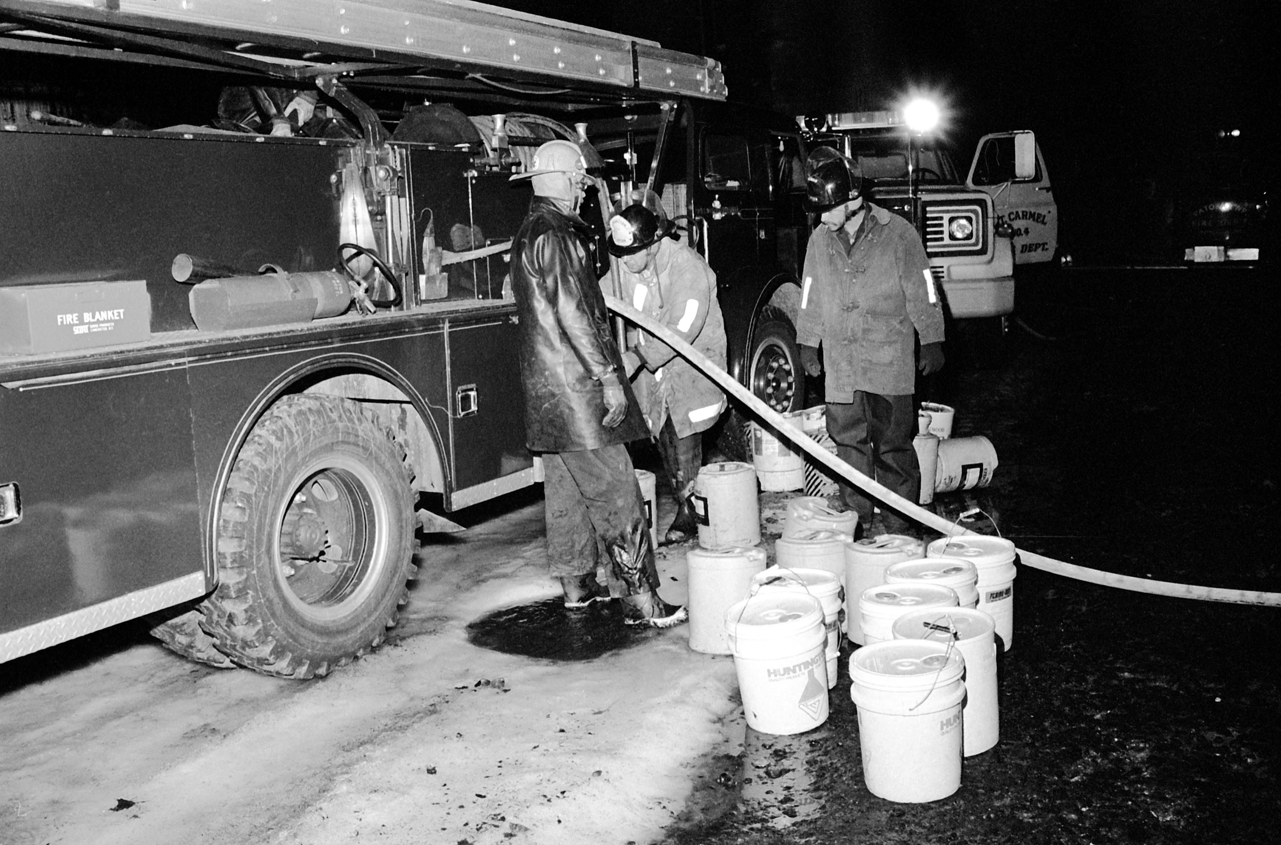 The size of the fire meant that extra units responded. Here, the Mt. Carmel, IL Fire Department is on the scene. The plastic buckets contain Flame-Out, presumably a fire retardant. A 420,000 gallon tank containing diesel fuel, naphtha, and kerosene exploded at Princeton Refinery, Inc., resulting in a fire fought by units from 12 different fire districts; it was finally extinguished with the aid of a tower and foam unit from the Texaco refinery in Lawrenceville, IL.