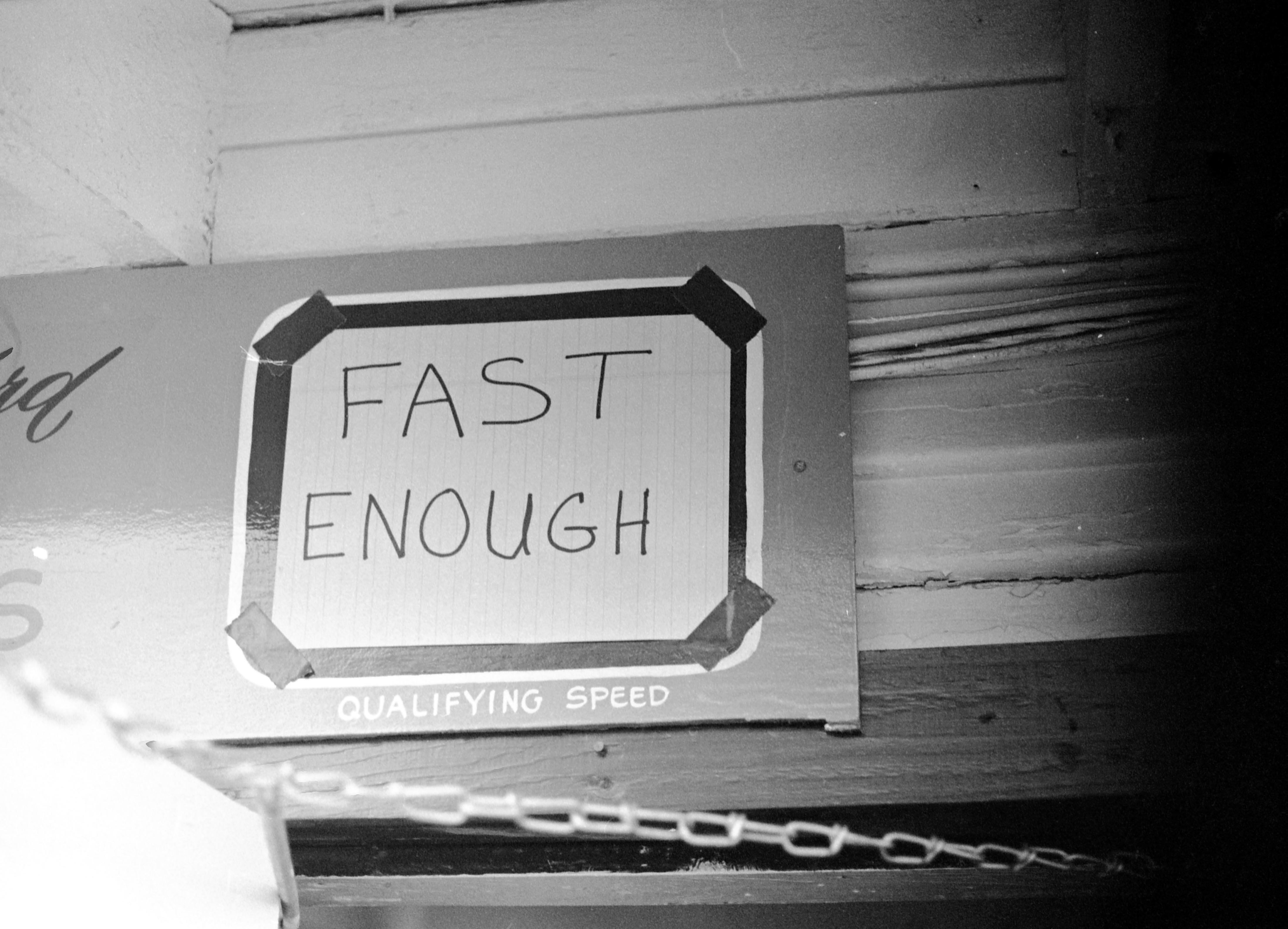 Sign on wall in Daniel William ""Spike"" Gehlhausen's bay that proclaims that his qualifying speed was ""fast enough""