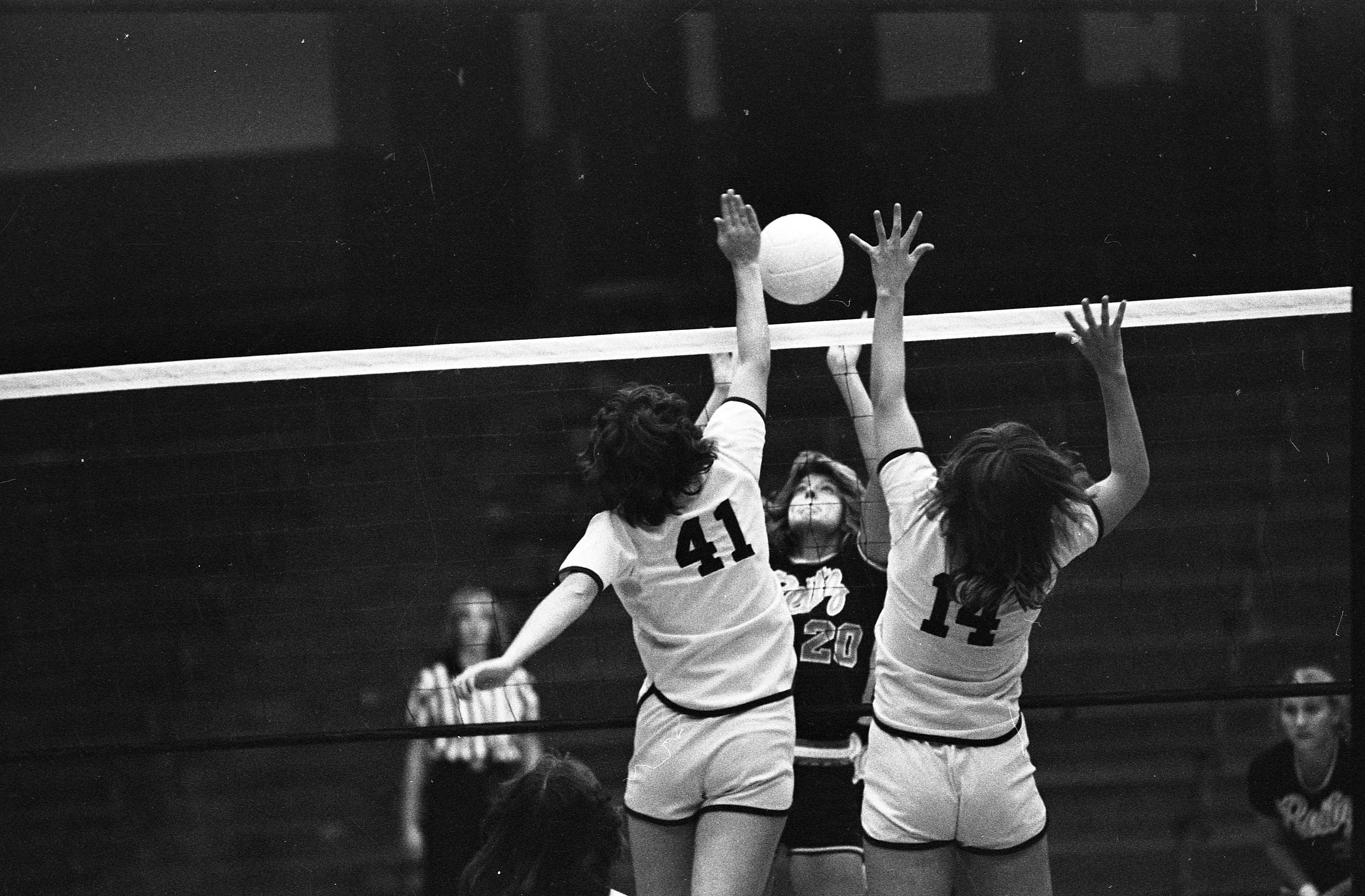 Francis Joseph Reitz High School girls volleyball game, opponent unidentified. Opponent here going for a block of Reitz player no. 20.